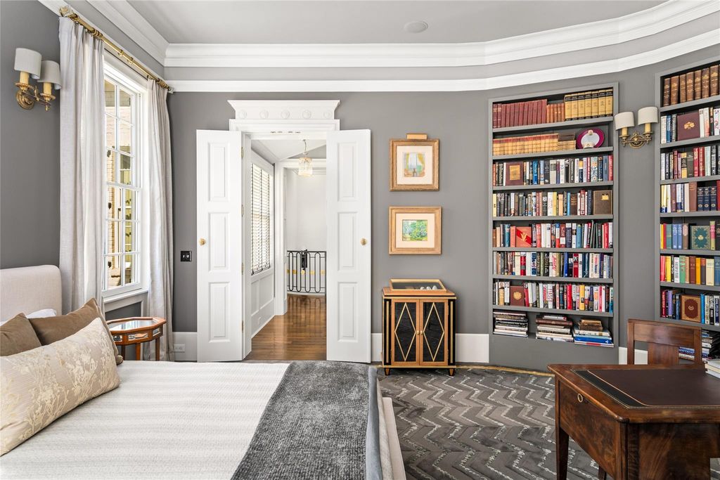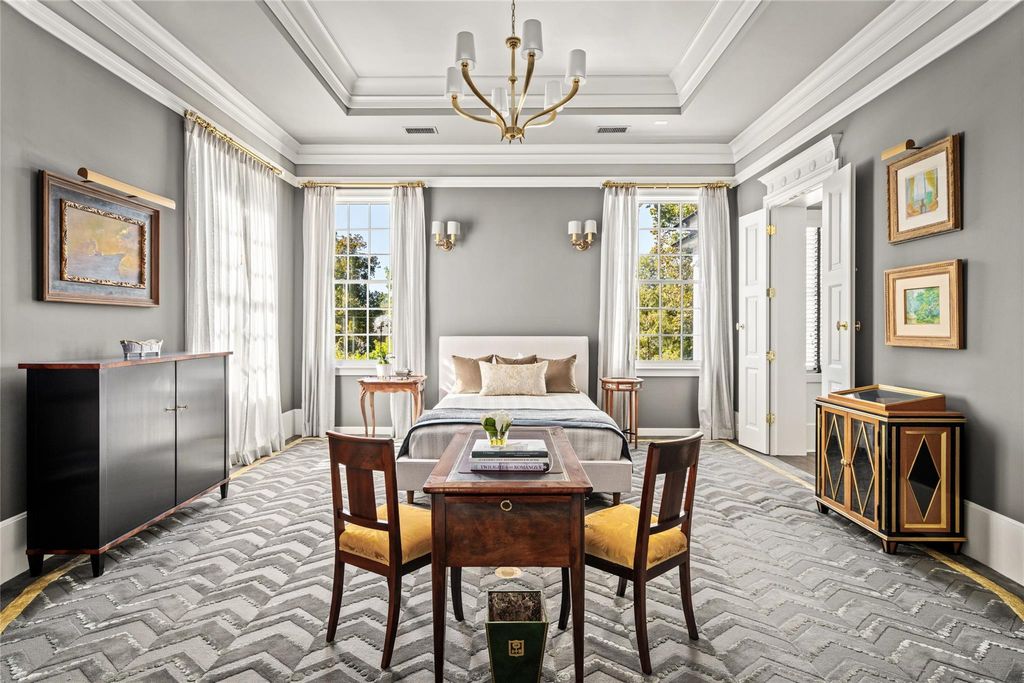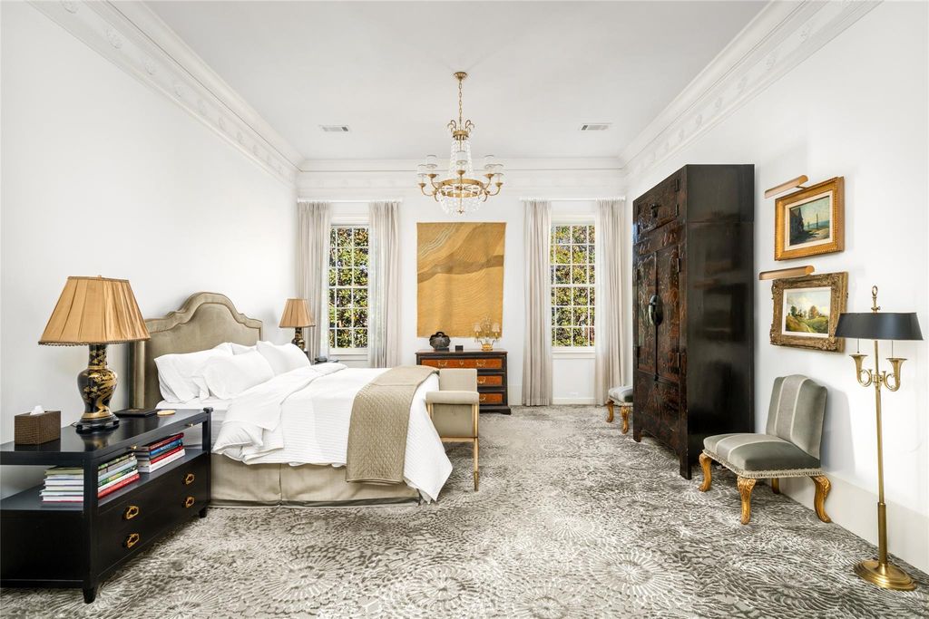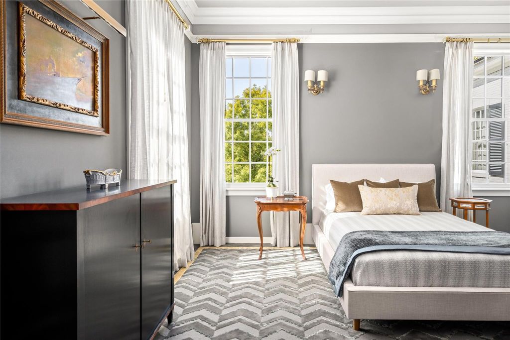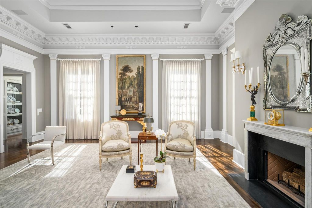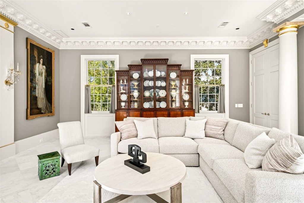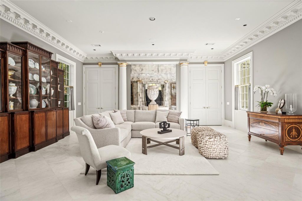 Timeless sophistication defines this Federal-style masterpiece by acclaimed New York architect Ike Kligerman Barkley, with interiors by renowned designer Michael Siller. Every space reflects refined craftsmanship and architectural elegance. The formal living room showcases decorative moulding, smoked mirror panels, and marble flooring. A chef’s kitchen anchors the home with a marble-topped island, breakfast/dining room, and nearby laundry. The primary suite offers a serene retreat with reading alcove, custom carpeting by Hokanson, spa-like marble bath, dual closets, and private sitting room or office. The second-floor living room opens to a luminous sunroom framed by oversized windows overlooking manicured gardens. A secondary ensuite bedroom and main-level guest suite add comfort. Outdoors, landscaped gardens surround a charming dining patio. Elevator, generator, three-car garage, and gated drive complete this exceptional residence.