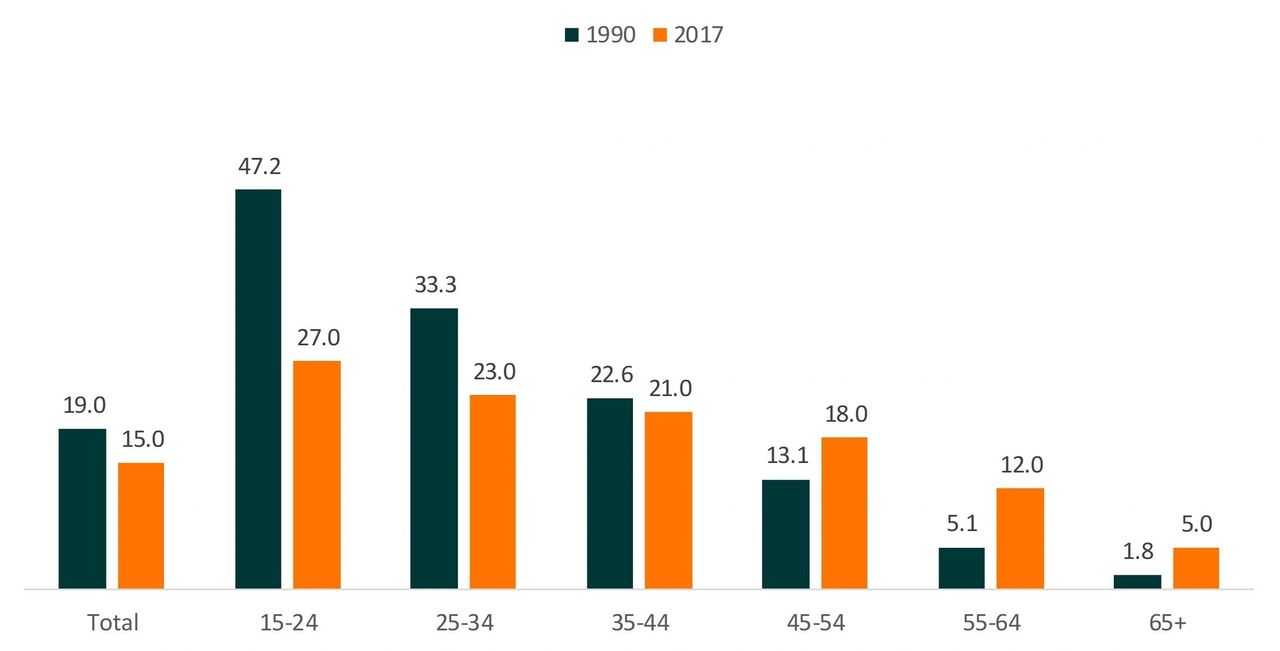 In 2015, 21 adults ages 40 to 49 divorced per 1,000 married persons in that age range – up slightly from 18 in 1990. By contrast, the divorce rate for adults ages 25 to 39 has fallen from 30 persons per 1,000 married persons in 1990 to 24 in 2015. This decline is attributed at least in part to younger generations putting off marriage until later ages. The median age at first marriage for men in 2016 was 29.5, and for women, it was 27.4 – up from 26.1 and 23.9, respectively, in 1990. In addition, those who do end up marrying are more likely to be college-educated, and research shows that college-educated adults have a lower rate of divorce.