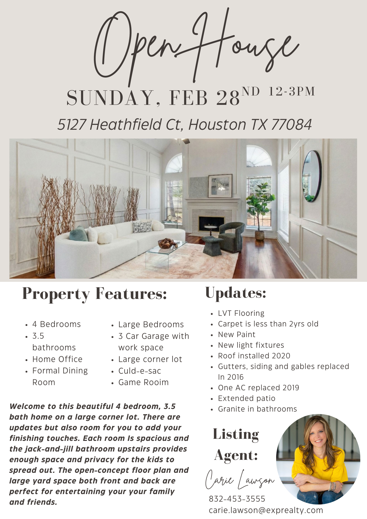 Great Price, Great Area and Lots of Space!!! This beautiful 4 bedroom, 3.5 bath home is nestled in the quiet neighborhood of Deerfield Village on a large corner lot, just minutes away from Hwy 6 and I-10. Updates like a newer roof, new carpet, new paint, new light fixtures and more makes this house a must see!!! All of the bedrooms in this home have ample space as well as the large game room upstairs and a spacious home office and dining room with the primary bedroom downstairs. Outside there is plenty of room to play on the large corner lot or entertain family and friends with a covered patio and extended deck out back. The 3 car detached garage is equipped with plenty of storage as well. You will not want to miss this one!