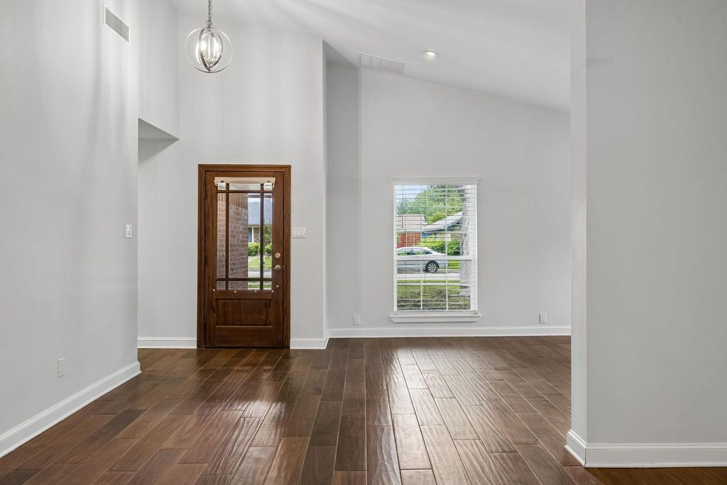 OPEN SAT APRIL 25, 2:30-5:00! What an incredible opportunity! Prime Plano location with fabulous updates throughout! While you will love the beautiful drive up appeal framed by gorgeous mature live oaks- just wait until you step inside! Be ready to be wowed! Open the beautiful half light updated wood door and you will immediately notice the soaring 12 foot vaulted ceilings and the expansive wood-look tile flowing seamlessly throughout the living spaces. Just inside you will find a great flex space- a perfect home office or second living space. The spacious open floorplan is so flexible with an incredible large modern fan and anchored with a floor to ceiling brick fireplace. The completely updated kitchen is a true gourmet kitchen with Monarch appliances including a french door wall oven with convection microwave and flat surface cooktop. The kitchen has fantastic storage with soft close cabinetry, multiple deep drawers for your pots and pans and other culinary tools. There is a wall pantry as well as a slide out section perfect for canned goods. The breakfast area offers patio access to the backyard space which is shaded by a grand mature tree as well. The primary bedroom is a true retreat with a large walk in closet and an absolutely stunning updated bath with large walk in shower and soaking tub with gorgeous quartz countertops and updated fixtures. The 3 secondary bedrooms all offer hardsurface flooring and nice closet space. The secondary bath is also beautifully updated including quartz countertop with wave sink, updated tub with lovely tile surround and a linen closet. This home is truly an impressive home in a great location. Convenient to dining, shopping and major throughfares.