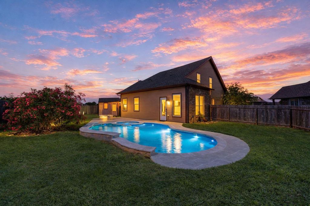 Welcome home to your own private paradise tucked away on a peaceful cul-de-sac! Gorgeous curb appeal and a stunning glass front door welcome you inside where you'll discover engineered hardwood floors, crown molding, upgraded lighting, a spacious game room, and a showstopping kitchen boasting a granite island, travertine backsplash, and custom 42" cabinets — all flowing effortlessly into the main living area and convenient first-floor primary bedroom. Granite countertops and custom cabinetry elevate every bathroom throughout. Out back, your sparkling in-ground pool, extended patio, and powered storage shed await — perfect for entertaining or unwinding under the stars. Move-in ready and ideally located — this gem won't last long!