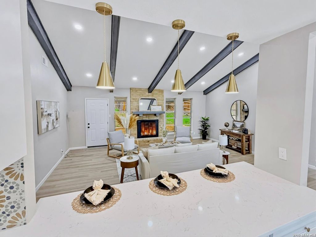 This is the one buyers have been waiting for in Forest Oaks, fully updated, move in ready, and packed with style and value. Three beds, two baths, two car garage on .269 acres sitting on a spacious lot with mature trees, a long driveway, and three sides brick, delivering strong curb appeal from the moment you arrive. Inside, the home opens up with high ceilings, exposed wooden beams, and a warm living area centered around a fireplace, all tied together with new luxury vinyl plank flooring and fresh carpet in the bedrooms. The kitchen is a standout with new custom cabinetry, stainless steel appliances, quartz countertops, a tiled backsplash, and sleek fixtures with gold accents, all overlooking the dining and living spaces for easy everyday living and entertaining. The primary suite feels like a private retreat with double quartz vanities, gold finishes, and an oversized walk in shower, plus direct access to a quiet outdoor lounging area. A covered patio, full privacy fence, and generou