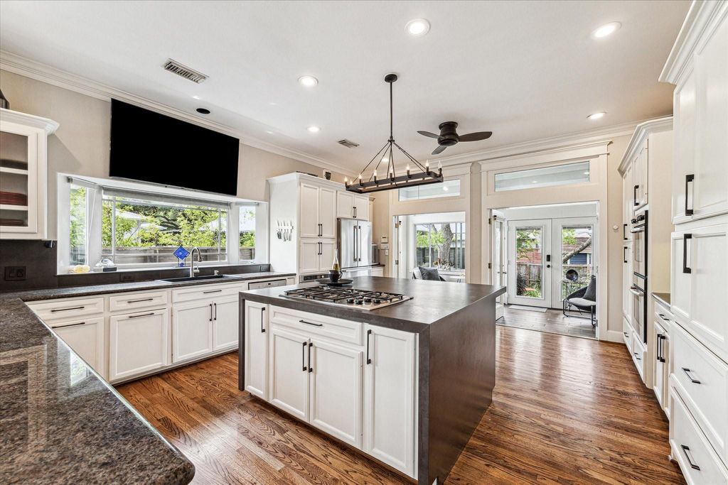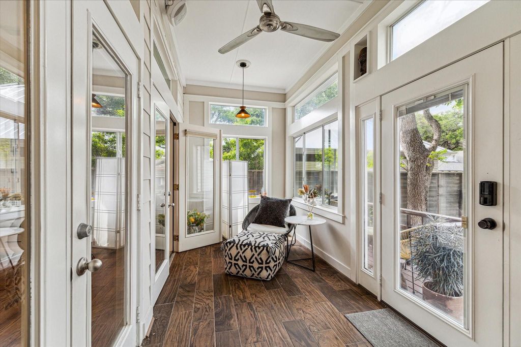 315 W 15th stands out for its ceiling height, natural light, first-floor living, and location. As you enter, 25-ft ceilings and multiple windows and transoms bring in an abundance of natural light and open up the main living space. The first floor offers a large living area that flows into the dining space and kitchen. The kitchen includes ample cabinet storage, generous prep space, and updated countertops. The primary suite is located on the first floor with direct access to the sunroom, creating a separate space for reading, coffee, or everyday use. Upstairs includes two secondary bedrooms, a landing area, and a covered porch overlooking the backyard. The home features landscaped front and back yards, with a fully fenced front yard. Alley access leads to the garage. Located in the Heights with convenient access to restaurants, parks, and trails. Home is in Heights West historic district, non-contributing.