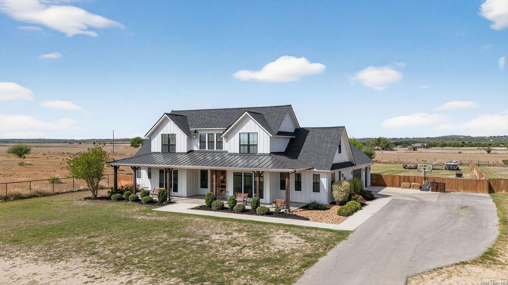 Welcome to this stunning custom-built 3,125 sq. ft. home offering 6 bedrooms and 3.5 baths located in the highly sought-after Medina Valley Independent School District. Designed with both elegance and everyday functionality in mind, this home combines modern farmhouse style with spacious living areas perfect for entertaining and family life. From the moment you arrive, the expansive covered front porch and beautiful double entry doors set the tone for the warmth and character found throughout the home. Inside, the open-concept floor plan features soaring ceilings, abundant natural light, and polished concrete floors, creating a bright and inviting living space. The living room showcases a striking stone fireplace wall and opens seamlessly into the gourmet kitchen and dining area. The chef-inspired kitchen is the heart of the home and features large center island with seating, Marble countertops, Custom cabinetry with accent lighting, Designer lighting fixtures, Spacious walk-in pantry,