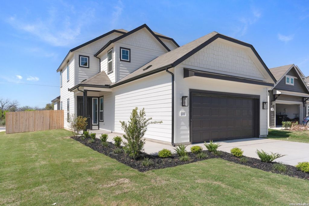 The only quick move in home in Casinas on a Corner Homesite. Final opportunity to own a new DRB Home in Casinas at Gruene, the only new home community located a short golf cart ride from Gruene Hall, the Guadalupe River, and downtown New Braunfels. This two story home offers three bedrooms and three full bathrooms with a functional layout designed for everyday living. The home includes a game room on the second level. Home features a two car garage and a covered patio offers a practical outdoor area for relaxing or entertaining. The entry features tongue and groove detailing that adds a clean and finished look. The kitchen is centrally located and opens directly to the living and dining areas. Features include a center island, omegastone countertops, an undermount sink, ceramic tile backsplash, and stainless steel Frigidaire appliances. Interior doors on the first level are eight feet tall, contributing to a more open feel. The owner suite includes a framed glass shower with ceramic ti