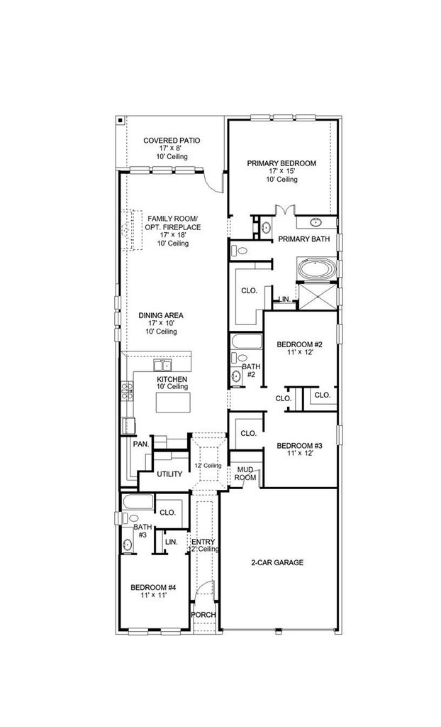 Extended entry with 12-foot ceiling leads to open kitchen, dining area and family room with 10-foot ceilings throughout. Kitchen features center island with built-in seating and a 5-burner gas cooktop. Family room features wall of windows. Primary suite with 10-foot ceiling and wall of windows. Dual vanities, freestanding tub, separate glass-enclosed shower and large walk-in closet in primary bath. A guest suite with private bath adds to this four-bedroom home. Covered backyard patio. Mud room off two-car garage.