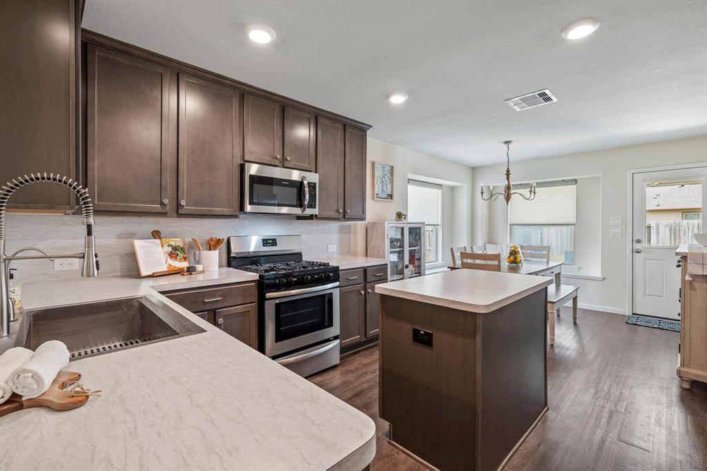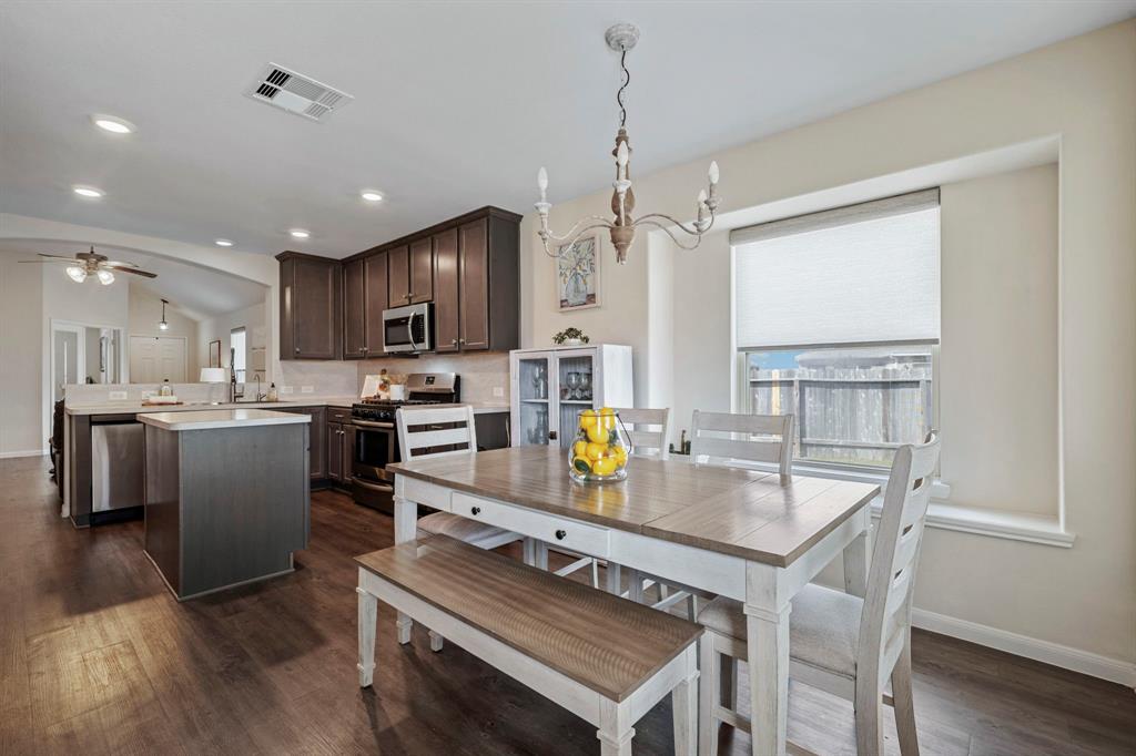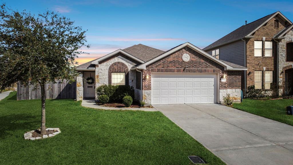 This lovely one-story residence features three spacious bedrooms, two full bathrooms, and a study. The open-concept floor plan is perfect for entertaining. The chef's kitchen is impressive, with a farmer's sink, stainless steel appliances, and ample cabinetry. This meticulously maintained home showcases designer touches throughout. The expansive backyard offers a covered patio with an extended slab, perfect for outdoor entertaining. The garage provides additional space for a workshop or golf cart. Located within a desirable community. Minutes from I-45, Galveston, La Porte and shopping/dining. The home is move in ready!