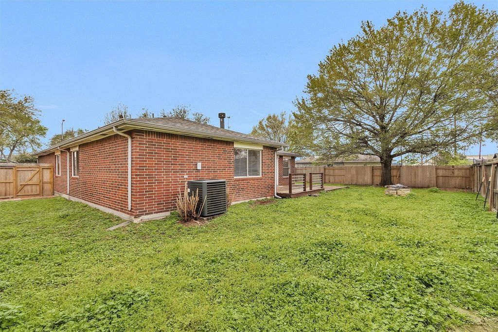Single-story brick home located in Spring, TX with convenient access to Rayford Rd, Riley Fuzzel Rd, and the Grand Parkway. The open living and dining area features wood flooring, recessed lighting, ceiling fan, and a fireplace with accent wall. Kitchen includes granite countertops, subway tile backsplash, stainless steel dishwasher, gas range, and double sink with backyard views. The primary suite offers an ensuite bath with double vanity, tub, and shower. Secondary bedrooms provide flexible space for guest rooms, office, or hobby space. Interior includes a mix of wood and tile flooring for durability and easy maintenance. Backyard features a fenced yard, wood deck patio, and fire pit area with space for outdoor seating and entertaining. Two-car attached garage and mature trees in the front yard. Located near shopping, dining, and commuter routes connecting to The Woodlands, I-45, and FM 2920.