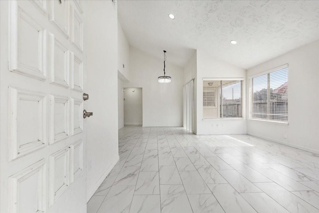Welcome home to this inviting residence in Humble, Texas, featuring high ceilings in the living room that create a bright and open atmosphere, along with a dedicated breakfast area and separate dining space. The remodeled kitchen showcases granite countertops, new cabinetry, sleek black appliances, recessed lighting, a striking glass chandelier, and tile backsplash, with the refrigerator included. Durable tile flooring flows throughout the home, complementing the fully remodeled bathroom with a beautifully tiled shower. A glass door from the breakfast area opens to a spacious, fully fenced backyard with no rear neighbors, offering added privacy and outdoor enjoyment. Additional highlights include updated plumbing, a clean modern look with no ceiling fans, a two-car garage with washer and dryer connections, and major system upgrades including a updated roof (2024) and HVAC system (2023). Make this home yours today!