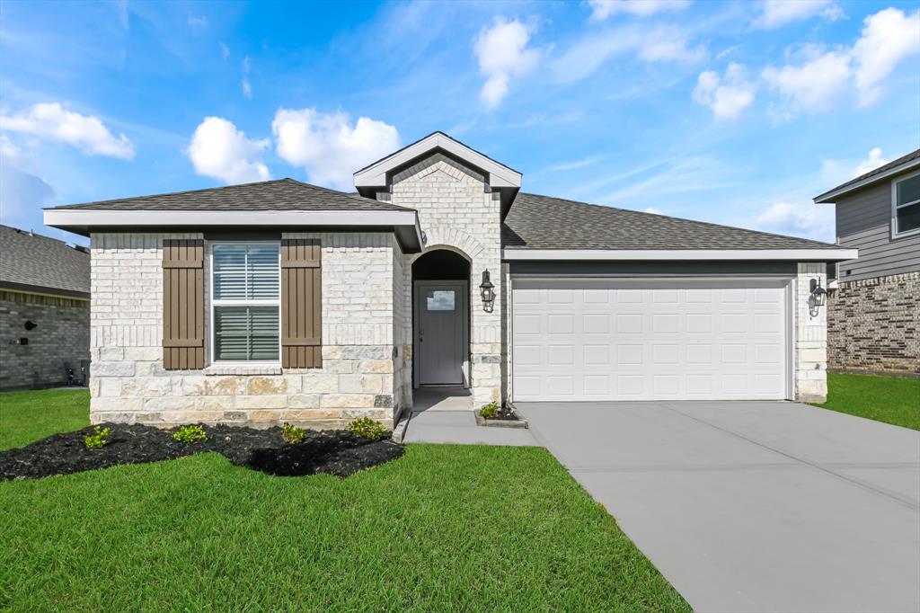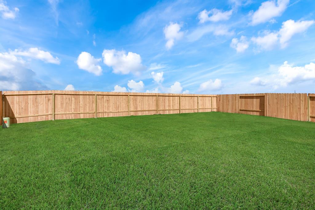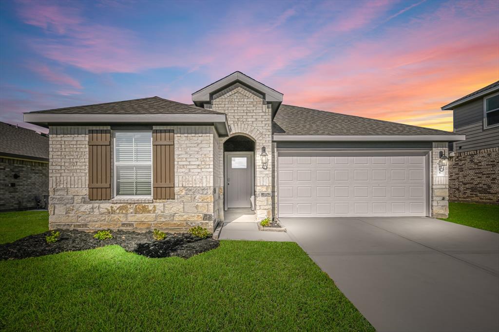 Raintree is located in City of Cove near Mont Belvieu, zoned to the highly desirable Barbers Hill School District **Low 1.65 Tax Rate** The Caden plan is a one-story home featuring 3 bedrooms, 2 baths, and 2 car garage. The entry opens to two guest bedrooms and bath with hallway linen closet. An open concept large combined dining and family area leads into the center kitchen. The kitchen includes a breakfast bar with beautiful counter tops, stainless steel appliances and separate pantry. The primary suite features a sloped ceiling and attractive primary bath with dual vanities, water closet and spacious walk-in closet. The standard rear covered patio is located off the family room.