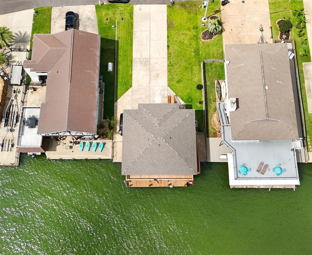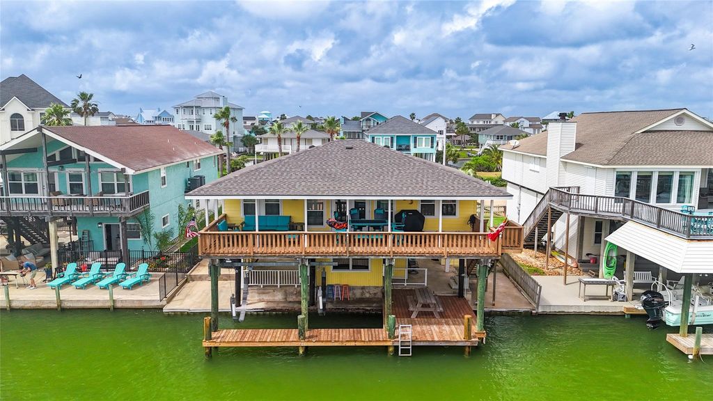 Welcome to your coastal retreat on sought-after Tiki Island—where island living meets modern comfort. Tiki Island isn’t just a location—it’s a lifestyle. This waterfront home features a bright, open-concept layout filled with natural light and water views from nearly every room. The kitchen offers ample counter space and flows seamlessly into the living and dining areas, perfect for entertaining. Enjoy mornings and sunsets from the covered balcony, or relax on the spacious deck overlooking the canal, ideal for grilling and gathering. The secondary bedroom is generously sized for guests. Downstairs, a private boathouse with lift provides easy access to Galveston Bay, plus a shaded entertaining area and convenient bathroom. A brand-new roof adds peace of mind. Minutes from beaches, shopping, and dining—this home offers the perfect blend of relaxation and convenience.