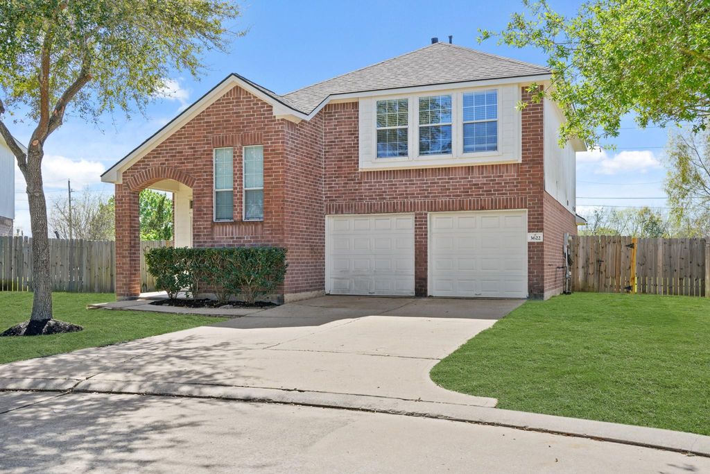 Move in ready home with newly installed gas stove/oven and dishwasher. The entry way and living room feature high/vaulted ceilings with tile throughout the first floor in the living room, dining room, kitchen, and primary bathroom. The main bedroom features laminate wood flooring which extends into the main bedroom's walk-in closet. Upstairs features two more bedrooms and a large family room, or perhaps a game room if you prefer, and a bathroom with a shower/tub combo, brand new dish washer and the oven. Laminate wood floors run throughout the upstairs, with the exception of the tiled bathroom. There is a fully fenced in oversized backyard with part of the fence line running along Brays Bayou.