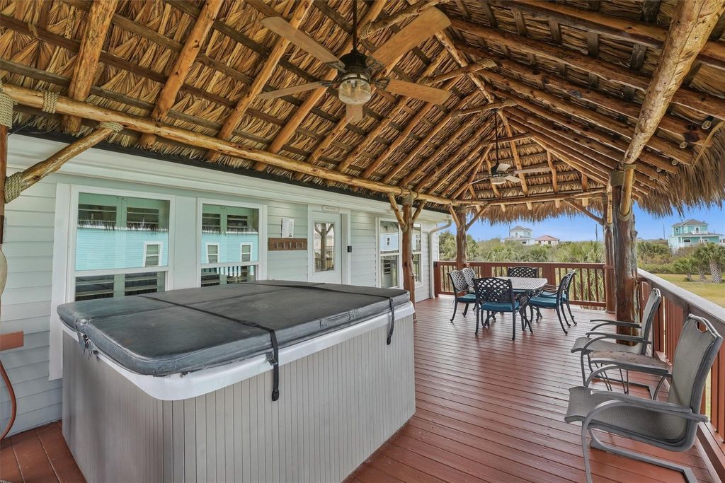 Welcome to your own slice of island living. This fully furnished 4-bedroom, 3.5-bath coastal retreat sits on an oversized lot and offers the kind of flexibility buyers love. Whether you’re searching for a personal getaway, a proven rental, or both. Mornings begin slowly on the expansive deck beneath the palapa, coffee in hand and Gulf breezes rolling through. Evenings are made for the hot tub after a full day at the beach, gathering with friends and soaking in the relaxed rhythm of coastal living. Inside, vaulted ceilings and an open-concept layout create a bright, airy space designed for connection. Custom cabinetry, quartz and granite surfaces and durable flooring make everyday living effortless and hosting even better. With no HOA and just a short golf cart ride to the beach and Waterman's Restaurant this home gives you the freedom to truly enjoy Galveston on your terms.