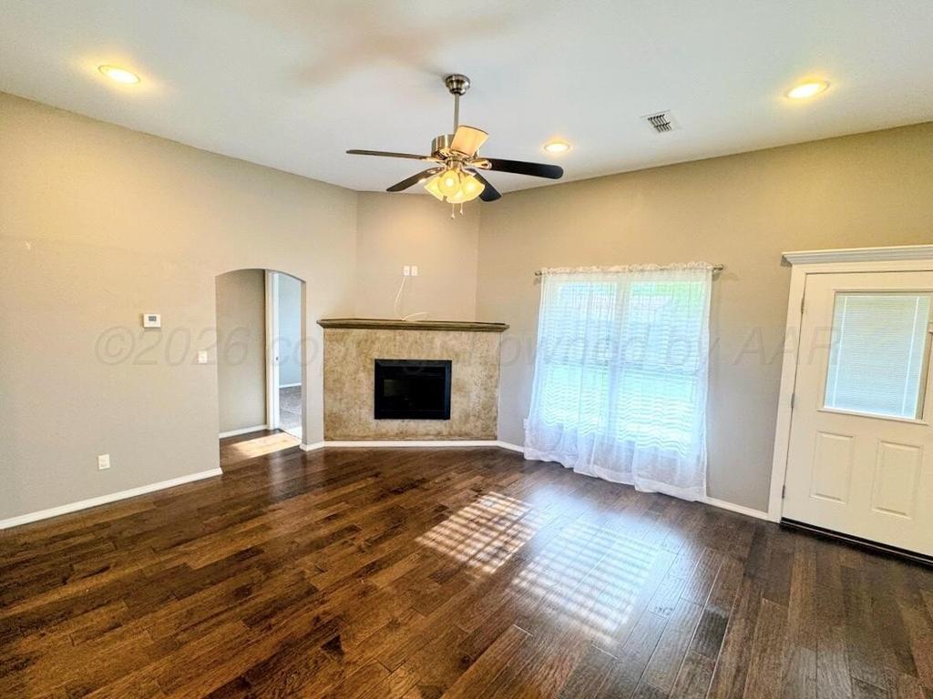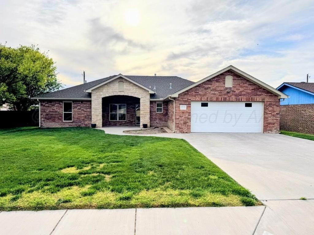 Inviting 3-bedroom, 2-bath home with a spacious open-concept living, dining, and kitchen layout perfect for everyday living and entertaining. The living room features a cozy fireplace, while the kitchen offers stainless steel appliances and opens to a bright dining area. A nearby laundry room with cabinet storage adds convenience. The primary suite includes a private full bath. Downstairs, the basement offers a versatile room ideal as a 4th bedroom, office, or game room. Outside features a 2-car garage, welcoming curb appeal, covered porch, and nicely sized backyard. Located in a desirable neighborhood near Ochiltree General Hospital.