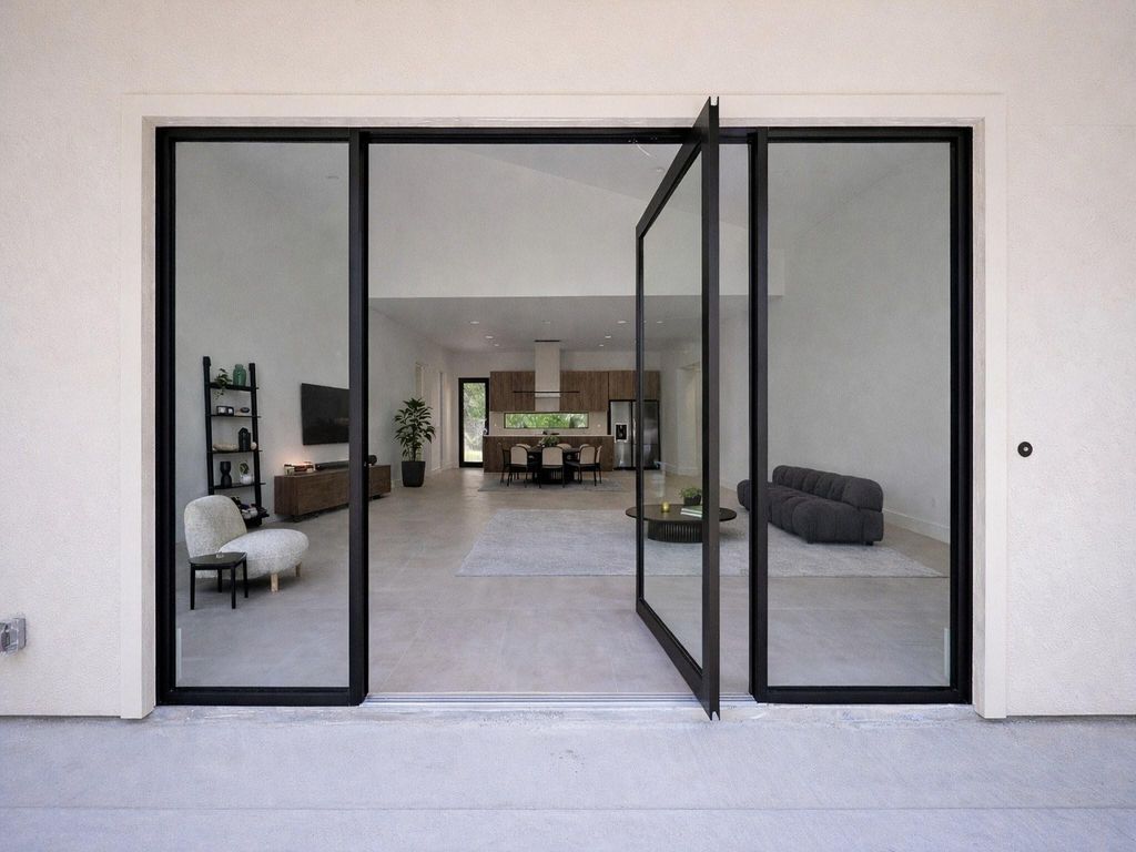 This stunning modern 4-bedroom, 3-bath home offers a seamless blend of luxury, space, and privacy, set on a large lot with a wooded backyard and no rear neighbors. A striking oversized pivot door creates a bold first impression, opening into a light-filled interior with soaring ceilings in the living room and an open-concept design built for both everyday living and entertaining. At the heart of the home, the kitchen features sleek Dekton porcelain countertops, a massive island, and a layout that flows effortlessly into the living area. The primary suite is a true retreat, complete with a spa-inspired bathroom showcasing a walk-in shower with dual shower heads. Both the primary and a guest bedroom feature sliding glass doors that open to the backyard deck, creating a seamless indoor-outdoor connection. Step outside to a covered patio overlooking the expansive, private backyard—perfect for relaxing or entertaining.