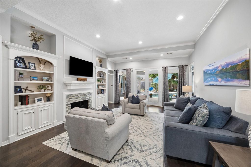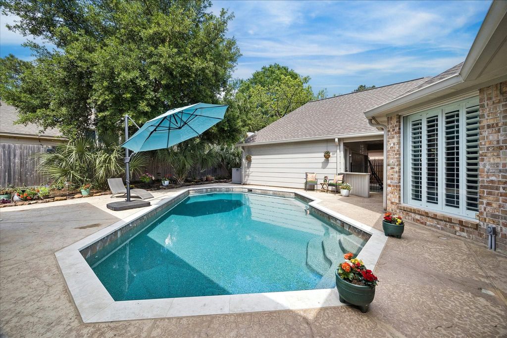 Tucked on a quiet cul-de-sac w/ mature trees, this beautifully updated 1-story offers style & easy flow. Open sightlines lead from formal living to covered patio & sparkling pool. Flexible dining area currently used as office. Kitchen features large quartzite island, abundant cabinets & bar seating, all open to spacious den w/ pool views. Private primary retreat includes dual vanities, soaking tub, oversized glass shower & 2 closets. Secondary bedrooms are generous w/ Jack & Jill bath, plus 4th bedroom w/ en suite. Backyard boasts light-filled covered patio, pool & lush landscaping. Porte-cochère adds extra parking. Zoned to sought-after schools & never flooded.
