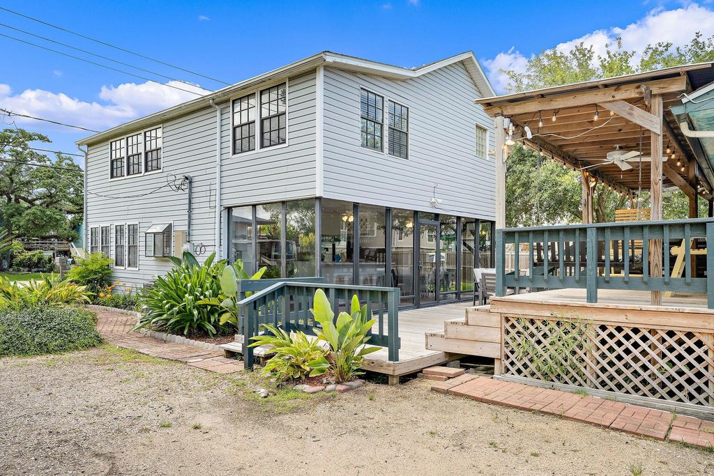 Set on a corner lot in a quiet neighborhood, this stylish 3-bedroom, 1.5-bath home is an entertainer’s retreat just three minutes from the Kemah Boardwalk. Inside, a welcoming layout features a spacious living room with a decorative fireplace, wet bar, and casement windows overlooking the private backyard. The kitchen flows easily to two expansive patios—ideal for year-round outdoor living with a fire pit and multiple seating areas. Upstairs, three comfortable bedrooms and a full bath offer restful space, while a main-level half bath adds convenience. A detached 2-car garage provides storage, and a carport offers additional parking. Whether you're seeking a primary residence, vacation home, or investment opportunity, this home delivers comfort, charm, and proximity to coastal attractions. Furniture is negotiable. All measurements are approximate.
