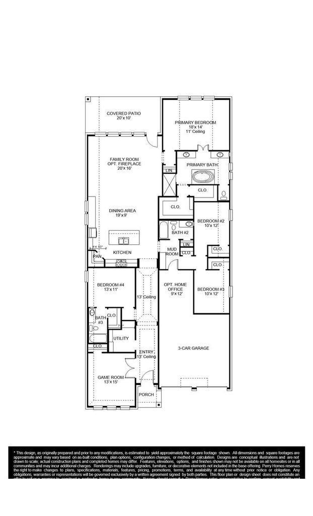 Entry with 13-foot ceilings framed by game room with French doors. Extended entry flows to the kitchen and dining area. Island kitchen with built-in seating space and a corner walk-in pantry. Family room with a wall of windows. Secluded primary suite. Primary bath offers dual vanities, garden tub, separate glass enclosed shower and two walk-in closets. Guest suite with a full bathroom and a walk-in closet. Secondary bedrooms and a utility room complete this one-story design. Covered backyard patio. Mud room just off the three-car garage.