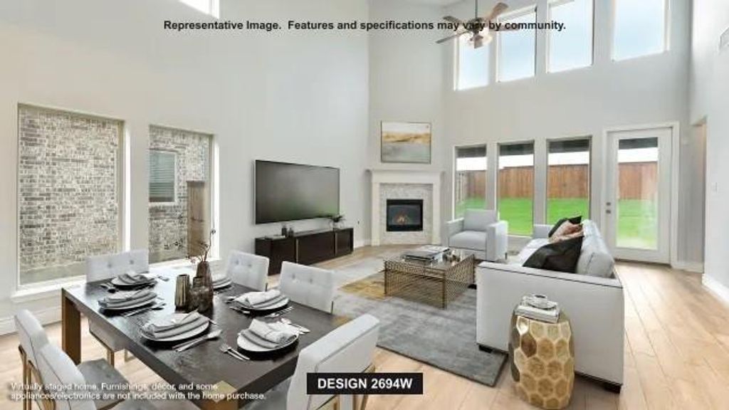 Home office with French doors and 11-foot ceiling set at two-story entry. Open kitchen features deep walk-in pantry, and a 5-burner gas cooktop, and generous island with built-in seating space. Dining area opens to two-story family room with wall of windows and a wood mantel fireplace. Primary suite includes bedroom with 10-foot tray ceiling. Double doors lead to primary bath with dual vanity, a freestanding tub, separate glass-enclosed shower and large walk-in closet. An additional bedroom is downstairs. Secondary bedrooms and game room with 10-foot tray ceiling are upstairs. Covered backyard patio. Mud room off two-car garage.