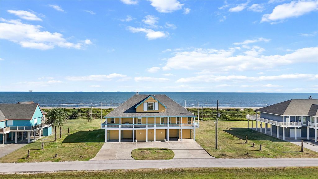 Stunning waterfront estate on over an acre with 166+ ft of Gulf of Mexico frontage in the gated golf community of Rancho Carribe in Crystal Beach. This custom-built home offers unobstructed Gulf views and exceptional outdoor living spaces for year-round enjoyment. Features include a Control4 Home Automation System, high-impact windows, automatic roll shutters, and whole-home speaker system. The home is professionally decorated, fully furnished, and move-in ready. The chef’s kitchen boasts high-end stainless steel appliances and opens to spacious living and dining areas with a gas fireplace. All bedrooms include en-suite baths. Upstairs features a game room with wet bar and a media room with theater seating and 120" projection screen. Enjoy the wraparound decks, outdoor lighting, and breathtaking panoramic views. Community amenities include a 9-hole golf course and gated access.