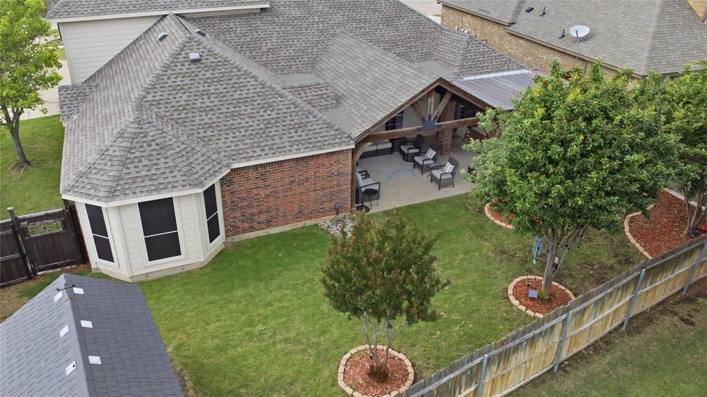 Discover a home that truly stands out. Nestled on a quiet cul-de-sac, this beautifully maintained property offers the perfect blend of curb appeal, functionality, and comfort. Mature trees, lush landscaping, and a side-entry garage create a warm and inviting first impression. The thoughtfully designed floor plan features split bedrooms for added privacy, a dedicated office, and a versatile game room that can easily serve as a fifth bedroom— offering the flexibility to fit your lifestyle. The spacious living area is centered around a cozy fireplace and flows seamlessly into the main living spaces, making it ideal for both everyday living and entertaining. The kitchen serves as the heart of the home, complete with an island, walk-in pantry, eat-in breakfast area, and abundant cabinet and counter space. The primary suite offers a relaxing retreat with a sitting area, dual vanities, garden tub, separate shower, and a custom walk-in closet system. Secondary bedrooms are generously sized and include ceiling fans for added comfort. Step outside to your private backyard oasis featuring a covered patio and fully equipped outdoor kitchen—perfect for entertaining or unwinding at the end of the day. The landscaped yard and private setting make it easy to enjoy outdoor living year-round. Additional highlights include newer carpet throughout, updated lighting, 12”+ attic insulation, sprinkler system, and a separate utility room with sink and full-size washer and dryer area. Located in a community with a pool, greenbelt, playground, and fishing, this home offers more than just a place to live—it offers a lifestyle.Schedule your showing today! Information deemed reliable but not guaranteed. Buyer and buyer’s agent to verify all information, including measurements, schools, and features.