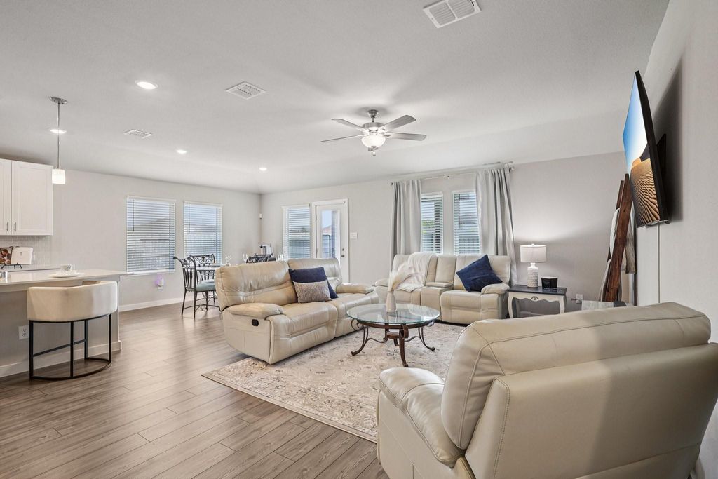 Privacy, fountains, and a premium lot—this is the kind of setting buyers wait for and rarely get. Beautiful 4-bedroom, 3-bath home situated on an oversized premium lot with no back neighbors and serene fountain views. Enjoy privacy and tranquility rarely found. Luxury vinyl flooring flows through the main living areas, while plush frieze carpet adds comfort to the bedrooms. Ceiling fans in all bedrooms and the living room provide year-round comfort. The spacious primary suite features a bay window with peaceful views and a spa-style bath offering dual vanities, a garden tub, a large walk-in shower with built-in seating, and a generous walk-in closet. The open-concept kitchen overlooks the living area and showcases elegant quartz countertops—perfect for entertaining and everyday living. Meticulously maintained with a like-new feel and truly move-in ready. Call today for a private tour and let's get moving!!