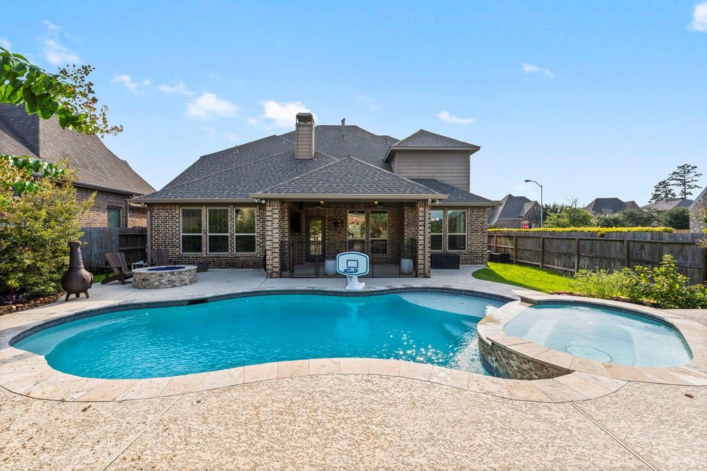 This lovely home sits on a spacious lot and offers a functional, open layout filled with natural light, crown moulding, and ample storage. The island kitchen features stainless steel appliances, double ovens, and a breakfast bar that opens to the dining area and living room with a cozy gas fireplace. The primary suite is conveniently located downstairs with a spa-like bath, while upstairs you’ll find three additional bedrooms, a game room, and a media room. Step outside to your private backyard retreat with a covered patio, stone fire pit, heated pool with oversized sundeck and spa, plus a storage shed. A 3-car tandem garage and large mudroom complete this amazing home. Pool maintenance included in lease!