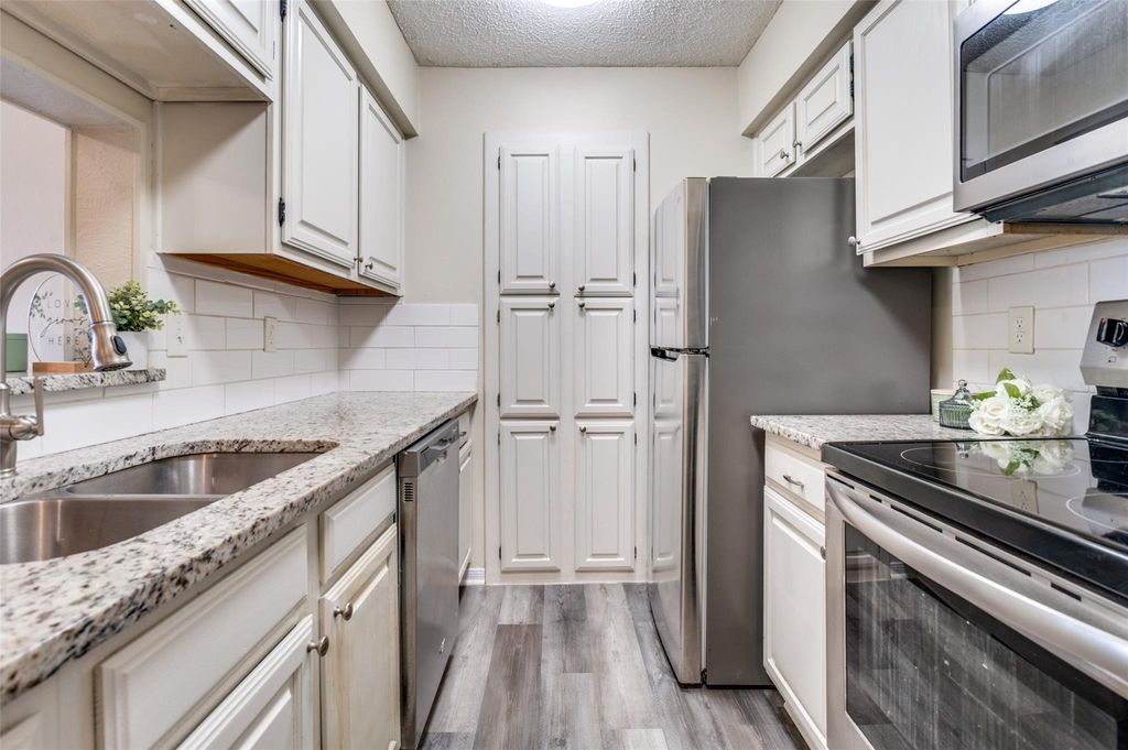 Awesome location in the Cloisters Condominiums of North Arlington. Updated second floor unit ensures no noisy neighbors above you. Kitchen has stainless steel appliances, quartz countertops, electric range, microwave and refrigerator. Extensive wood like flooring and NO CARPET! The updated kitchen is open to living with brick fireplace. Bedroom has two windows and walk-in closet. Bath offers dual sinks and updated tile tub-shower combo. The amenities in the Cloisters include tennis-pickleball courts, recreation center with table games, racquetball courts. Clubhouse, multiple pools, fitness room, sauna. Location is within walking distance to ATT Stadium, Choctaw stadium, Globe Life Park, Texas Live, with dining and shopping. No FHA or VA financing.