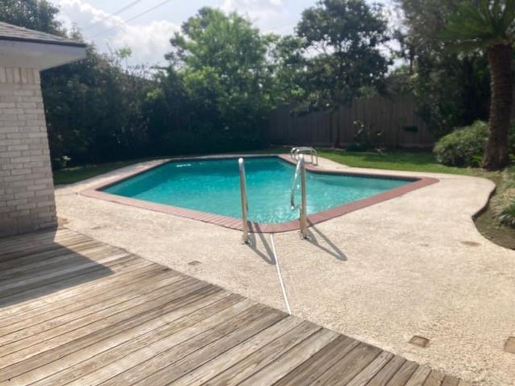 Beautiful family room with high ceilings, skylights, many built-ins and wood floors. Windows overlook the sparkling pool. The formal living and dining are accented with beautiful wood floors. The kitchen has a JenAire cooktop with grill and extra burners. Refrigerator is reserved. Lots of storage. A large master bedroom has expansive view of the pool with easy access out sliding glass doors. Three other bedrooms with some walk-in closets. The half bath is off the indoor laundry room with gas and electric dryer hookups. Enjoy the wonderful pool and patio space for entertaining. Energy features include recent high efficiency AC, double pane windows, new roof and upgraded power panel with surge protector.