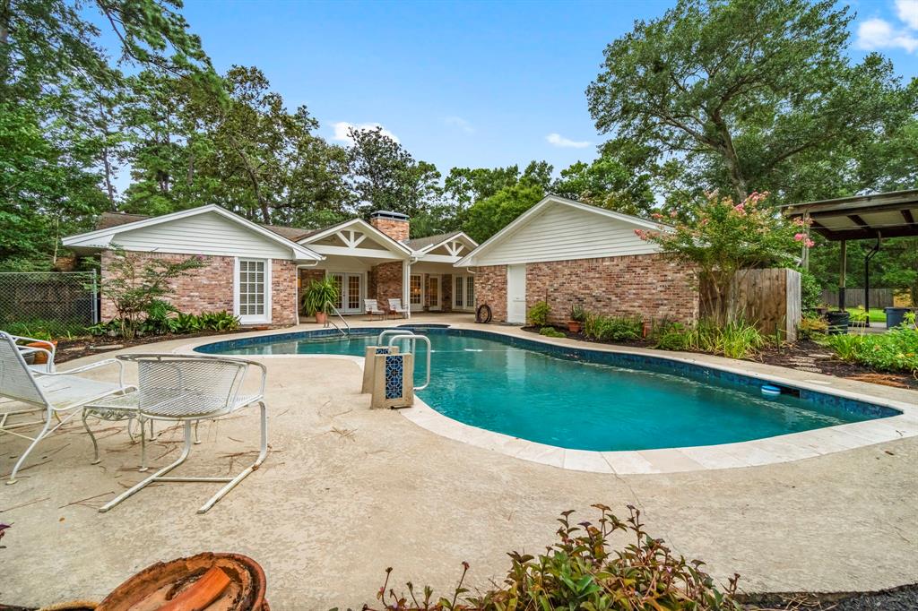 Beautifully updated single story in Oak Ridge on an expansive lot with pool/spa, covered lanai for outdoor living and a 2-car detached garage. The adjoining lot is also for sale separately - MLS #76865173. EXCELLENT LOCATION, close proximity to I-45/The Woodlands. Brick exterior w/shutters & front porch enhance the welcoming curb appeal. Sprawling front/ back lawns. Living room is the perfect spot for visiting or playing games. Family room has refreshing white walls/FP, French doors to lanai/pool, awesome brick floors, B/I desk with cabinets/shelves. Gorgeous well-designed kitchen has new modern white cabinets, quartz counters, backsplash, lighting/plumbing fixtures, stainless steel appliances, and peninsula island open to family for serving. Dining has room for large table; Sunroom. Primary suite & 2 secondary bedrooms have vinyl plank floors/plantation shutters. Both baths have beautiful updates, dual vanities, W/I showers, modern on-trend colors/finishes. Custom closets. Must see!