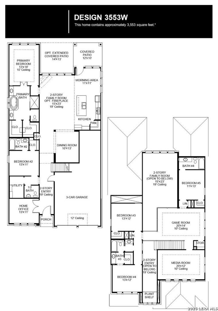 Home office with double doors framing the entry. The two-story entry extends past the dining room to the kitchen and family room. Island kitchen offers built-in seating space and a corner walk-in pantry. Formal dining room. Two-story family room with 19-foot ceiling and sliding glass doors. Morning area just off the kitchen offers a beautiful view of the backyard. Primary suite with three large windows. Primary bathroom features a French door entry, dual vanities, a freestanding tub, separate glass enclosed shower and two walk-in closets. Guest suite with a full bathroom and a walk-in closet on first level. Second floor hosts a large game room, media room, an additional guest suite and secondary bedrooms with a Hollywood bathroom. Additional storage space, half bathroom, linen closet and a utility room completes this generous design. Extended covered backyard patio. Landscape features a 5-zone sprinkler system. Three-car garage.
