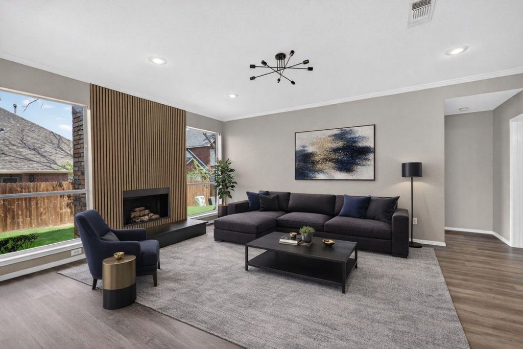 REMODELED AND MOVE-IN READY! Welcome to this beautifully remodeled 4-bedroom, 2.5-bath home with a private office, situated on a corner lot and zoned to acclaimed Flower Mound High School. Every detail has been thoughtfully updated, including fresh interior paint, luxury vinyl plank flooring throughout the main living areas, a sleek, modern kitchen, new decorative lighting, and a stunning floor-to-ceiling fireplace that anchors the light-filled living room. The main level offers a functional and inviting layout, with a private office and formal dining room at the front of the home. Toward the back, the open-concept design seamlessly connects the fully remodeled kitchen, living, and breakfast areas. The kitchen shines with new cabinetry, countertops, and hardware, plus a breakfast bar that opens to the living space - perfect for everyday living and entertaining. The living room is framed by floor-to-ceiling windows that flood the space with natural light, while the adjacent breakfast room features walls of windows and direct access to the backyard deck. A convenient half bath completes the first floor. Upstairs, you’ll find three generously sized secondary bedrooms, a full bath with dual sinks, and a versatile bonus room that can be used as a second living area, additional office, exercise room, or creative space. Step outside to relax or entertain on the deck with pergola, shaded by a mature tree and overlooking the spacious, grassy backyard. Located just three blocks from Thrush Park and minutes from shopping and dining in Flower Mound, this move-in ready home offers style, comfort, and an exceptional location. This is one you don’t want to miss!