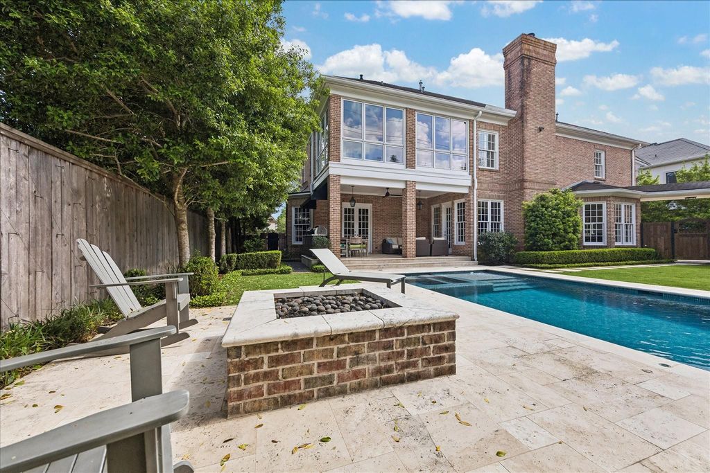 Exceptional custom home in the heart of Tanglewood, just steps from the Boulevard and its walking/running path. Extensively updated in 2011 and 2018, this classic residence offers a double-height entry, elegant living and formal dining rooms, and four ensuite bedrooms including the primary suite with two walk-in closets. The third floor features a spacious game/media room with kitchen and bath. Private quarters above the detached garage (720 SF per HCAD) include a kitchen, full bath, and sitting area. Highlights include a double-island kitchen with butler’s pantry, wet bar, powder bath, library, and exercise/sunroom overlooking the pool. Elevator-ready with two driveway gates leading to the porte-cochere and whole-house generator. Resort-style backyard with pool, spa, firepit, pool bath, covered summer kitchen, lawn space, and mature Holly trees for privacy.