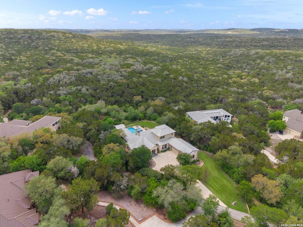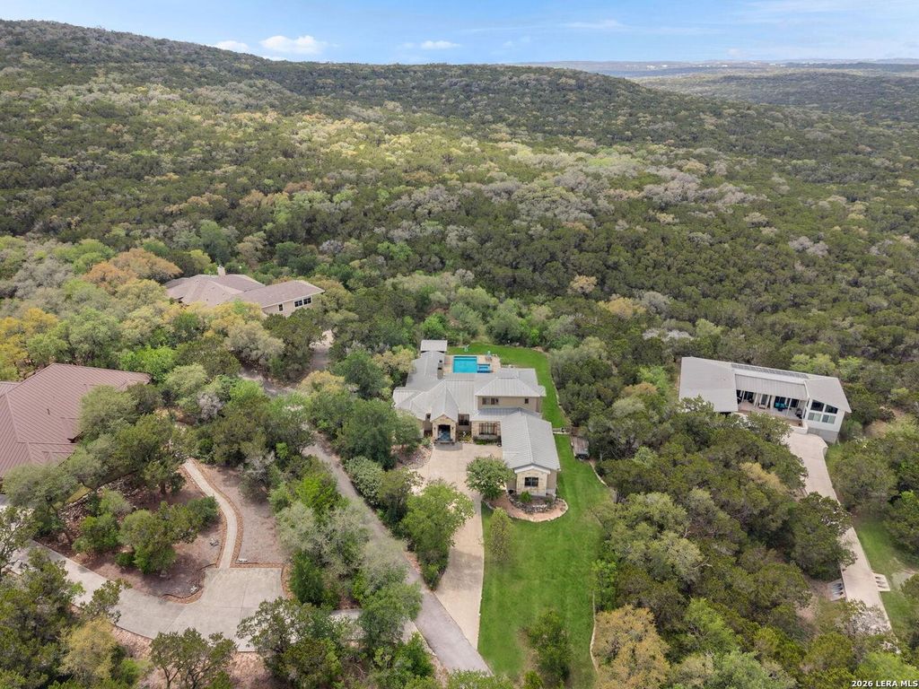 Rare Private Hilltop Estate Overlooking Government Canyon State Natural Area: Unparalleled privacy meets elevated design within this gated, hilltop sanctuary. Built by Luxury Home builder Mattern and Fitzgerald this home sits on the highest point upon a sprawling one acre lot which is adjacent to the 13,000 acre Government Canyon State Natural Area, the home offers a commanding presence with a deep off-street setback, a level-access motor court, and a three-car garage. The exterior is built to last with heavy Hill-Country stone blocks, stucco, and a standing seam metal roof. The interior showcases stained concrete floors and a chef's kitchen equipped with dual islands, granite countertops, stainless steel appliances, a breakfast bar, dining nook, and $75,000 in custom cabinetry. The expansive living room, anchored by a floor-to-ceiling stone fireplace, provides a front-row seat to the stunning pool, spa, and the canyon beyond. The intelligent floor plan features a primary suite and a s