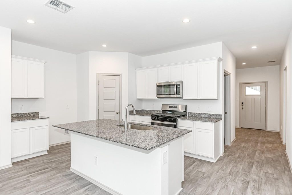 Welcome to the Kingston floor plan in Canterra Creek—a stunning single-story home offering 2,031 sq. ft. of living space! This home features 4 bedrooms, 2 bathrooms, a 2-car garage, spray foam insulation for unmatched comfort and style. Upon entry, you'll find 2 bright secondary bedrooms with a shared bathroom, featuring vinyl flooring, a linen nook, and a tub/shower combo. At the end of the foyer, the open-concept family room, dining room, and L-shaped kitchen provide the perfect space for entertaining. The kitchen offers extra counter space, a kitchen island, a pantry, and stainless-steel appliances. The utility room provides washer/dryer space and extra storage. The 3rd bedroom has a tall closet and a window to the side yard. The primary bedroom includes 2 windows with backyard views, and the ensuite offers a double sink, vinyl flooring, a linen nook, and a walk-in closet. Unwind on the back patio and embrace the outdoors. Call for a tour today—this home is a must-see!