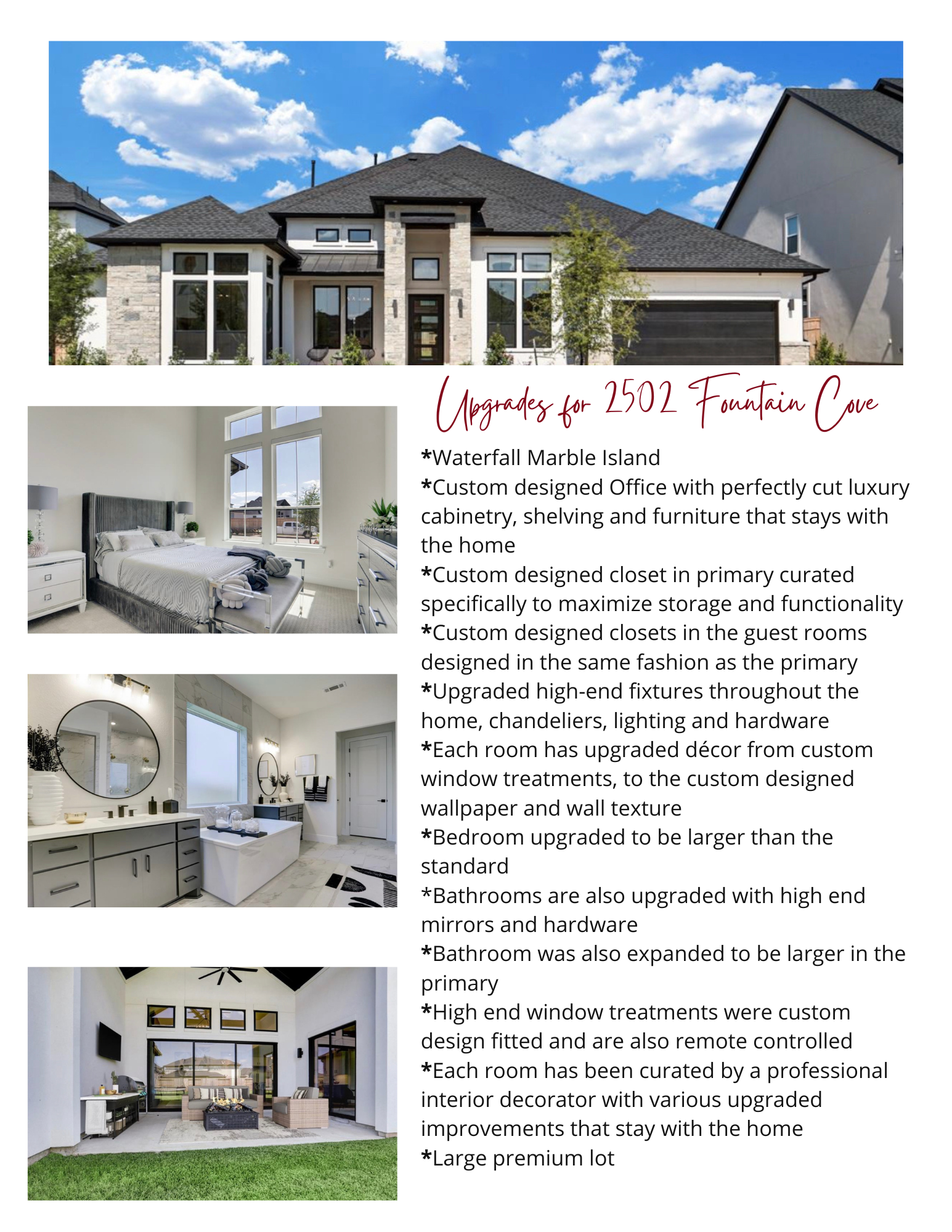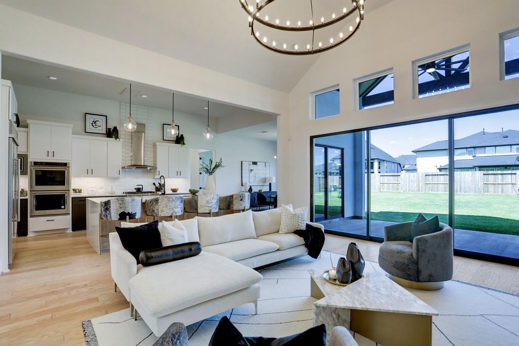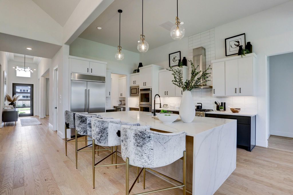 Experience refined luxury living in this meticulously crafted Toll Brothers estate. This stunning 4-bedroom, 4.5-bathroom home features soaring 20-foot ceilings and an open-concept design perfect for sophisticated entertaining. The gourmet kitchen offers dual ovens, marble waterfall island, custom cabinetry, and a butler’s pantry with exceptional storage. Enjoy a custom study with built-in shelving, dedicated media room pre-wired for surround sound, and formal dining with designer lighting. The luxurious owner’s suite has a spa-inspired bath with oversized soaking tub, glass-enclosed shower, dual vanities, and a walk-in closet with custom organization. Additional highlights include hand-selected hardwood flooring, crown molding, designer fixtures, automated shades, Tesla charging station, and mature landscaping. The high-end furniture and décor are available for purchase to elevate your luxury lifestyle, in one of Missouri City’s most desirable neighborhoods.