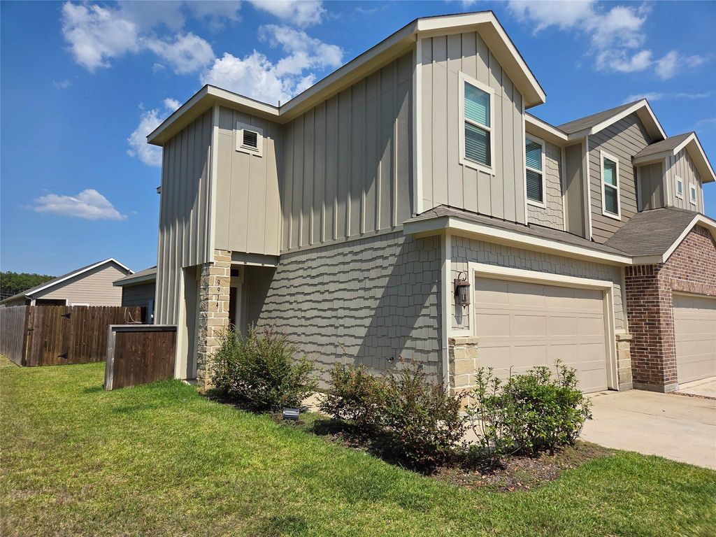 Welcome Home. 2 story 3 bedroom 2.5 bath home. On corner lot and large backyard. All bedrooms up, half bath down. This home features a popular open floor plan with upgraded features such as granite countertops, breakfast bar, stainless steel appliances with island in the kitchen. Tile backsplash, brushed nickel fixtures. High ceilings with ceiling fans and plank tiling with wood grain on the floors. Double sinks in the master with a shower and walk-in closet. Sit outside on the covered patio overlooking a fenced back yard. HOA maintains the front lawn only. Shopping, entertainment, restaurants close by. Ready for Immediate Move-in!