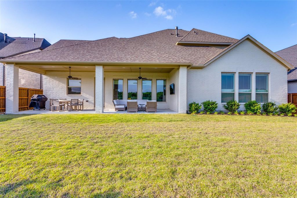 Built in 2024 and loaded with premium upgrades, this gorgeous 5 bedroom, 5.5 bath, 3-car garage home sits on a coveted greenway lot with peaceful views from the back porch — and it’s located in one of the most amenity-rich master-planned communities in the entire DFW Metroplex. From the moment you walk in, the craftsmanship is impossible to miss. White oak hardwood floors flow through the main living areas, cedar beams anchor the living room ceiling, and a gas fireplace with remote and wall switch creates the perfect gathering space. Custom built-ins with floating shelves, upgraded lighting, and premium window treatments give the home a polished, designer feel throughout. The kitchen is built for the way families actually live. Quartzite countertops, extended cabinetry with premium hardware, a walk-in pantry, and an additional display hutch give you both the storage and the style. The primary suite is a true retreat, featuring an extended walk-in shower, a freestanding soaking tub, and the kind of finishes you’d expect in a luxury build. Solid core doors and additional interior insulation run throughout the entire home, making it noticeably quieter and more energy efficient than standard new construction. Both garages feature coated and finished concrete floors, and outside you’ll find an upgraded irrigation system and a stone-bordered front flower bed that adds great curb appeal. Then there’s the neighborhood. Walsh is a 7,200-acre master-planned community just 12 minutes from downtown Fort Worth, zoned to the award-winning Aledo ISD with an elementary school right on site. Residents enjoy a resort-style athletic club, a family pool, a Junior Olympic lap pool, tennis and basketball courts, over 32 miles of hike and bike trails, a stocked fishing lake, a kayaking lake with dock, a makers space, dog parks, and a neighborhood market. HOA includes front yard maintenance and 2 GB high-speed internet in every home. This one truly has it all.