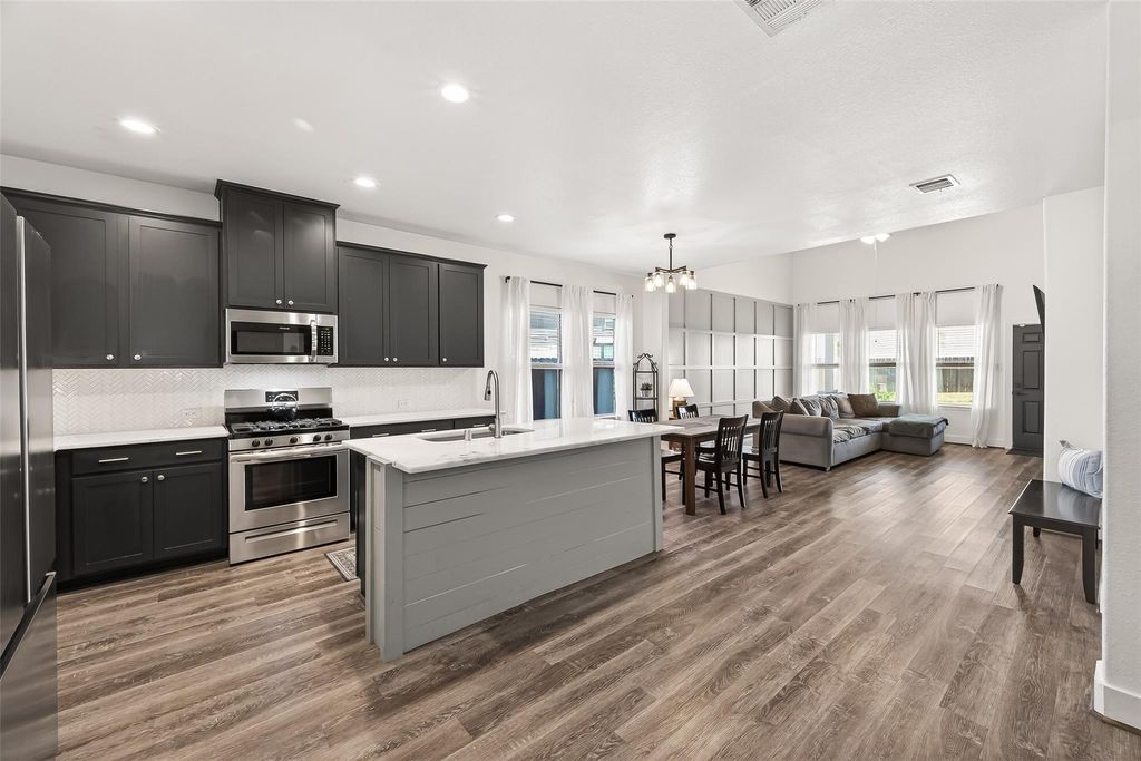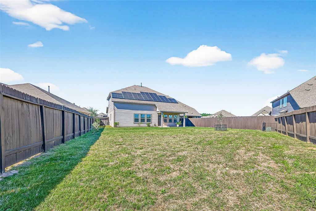 Experience the benefit of energy-efficient living with fully owned solar panels and a Tesla Powerwall, providing reliable backup power and no monthly lease payments. Situated at the end of a quiet cul-de-sac, this 4-bedroom, 2.5-bath home offers a flexible layout designed for everyday living. The main floor features an open-concept living area with warm wood flooring and a versatile office or flex room. The beautifully appointed kitchen showcases custom cabinetry and a stylish tile backsplash while overlooking the living room with a statement fireplace. The spacious primary suite includes dual vanities and a large walk-in closet. Upstairs you’ll find a generous game room, three additional bedrooms, and a full bathroom. Outdoors, the expansive fenced backyard is ideal for gatherings with a covered patio and relaxing porch swing.