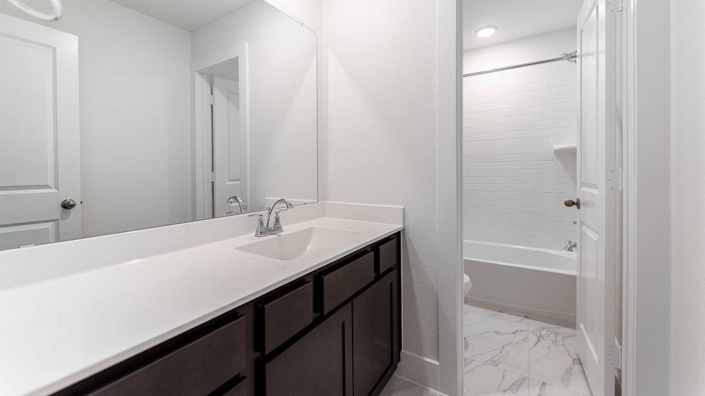 The captivating Hayden plan has four bedrooms, two-and-a-half bathrooms & both a game room and media! Castle Rock Communities - Model Home 27126 Talora Lake Dr. Katy, TX 77493