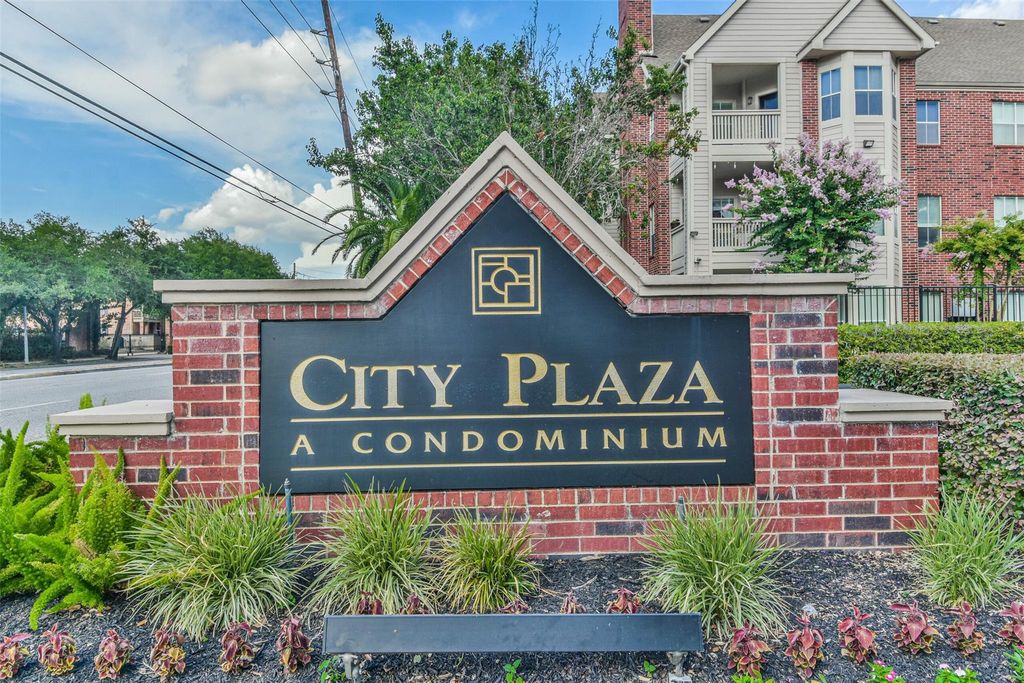 City Plaza Condominiums, a gated community with 24/7 guard attendant. TOP LEVEL HOME- Hardwoods in living and dining. Custom paint throughout. Spacious living/dining areas flow into well-appointed Remodeled kitchen featuring granite countertops, stainless-steel appliances & ample cabinetry. Newer Dishwasher and water heater. New Water filtration -kitchen sink. Full size washer/dryer. Vaulted Ceiling & Built-in bookshelves at entry. Spacious bedrooms ceiling fans & generous master closet. Bathroom features a Corian countertop w/dual sinks & combination tub/shower. A private patio offers extra storage & quiet outdoor retreat. Overlooking pool and oak trees Community Amenities—new roofs in May 2025, a fully renovated pool (2024), & 2026 renovated fitness center & Clubhouse. Internet included in HOA dues. Easy access to Metro Rail, restaurants, and Rice, UT and Baylor Universities. Perfect home ready for move in. Call for a private tour.