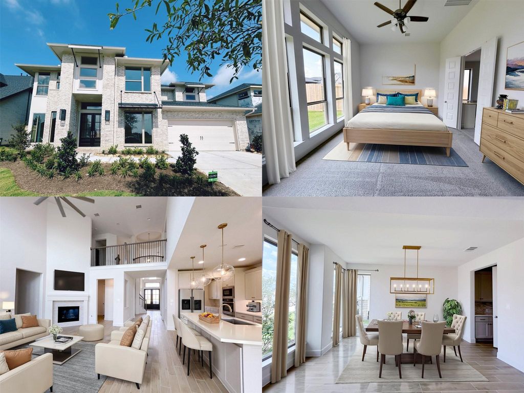 Two-story entry features curved staircase. Formal dining room and home office with French doors frame entry. Two-story family room with a wood mantel fireplace and wall of windows opens to kitchen and morning area. Kitchen features walk-in pantry, Butler's pantry, double wall oven, 5-burner gas cooktop and island with built-in seating space. First-floor primary suite includes bedroom with 12-foot ceiling and wall of windows. Dual vanities, corner garden tub, separate glass-enclosed shower and two walk-in closets in primary bath. A second bedroom is downstairs. A game room, media room, Hollywood bathroom and secondary bedrooms are upstairs. Extended covered backyard patio and 6-zone sprinkler system. Mud room off three-car garage.