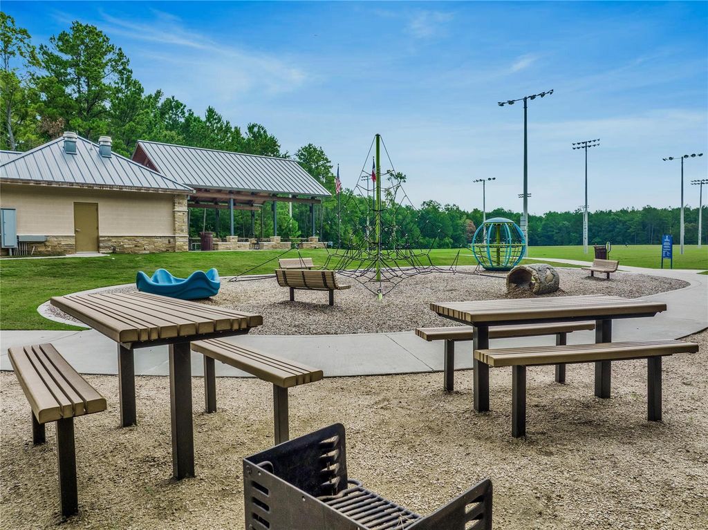 Experience elevated living in the heart of Woodforest—a premier golf course community with resort-style pools, clubhouse, splash pads, parks, trails, fitness center & sports courts. This home is practically new and built by one of Texas' best builders, Perry Homes. It offers 3 bedrooms, 2.5 baths, open-concept filled with natural light. The modern kitchen features quartz counters, breakfast bar, convection gas double ovens, gas cooktop, and freshly painted white cabinetry, all opening to the dining area and spacious family room with a gas log fireplace. The private primary suite includes dual sinks, an oversized shower, and a walk-in closet. Recent upgrades include new vinyl plank flooring throughout, plantation shutters, epoxy garage flooring, water softener, and refrigerator included. Enjoy the extended covered patio, and an amazing private yard with no rear neighbors. Over $25K in upgrades & oversize lot—offering exceptional value without the added expense after move-in.