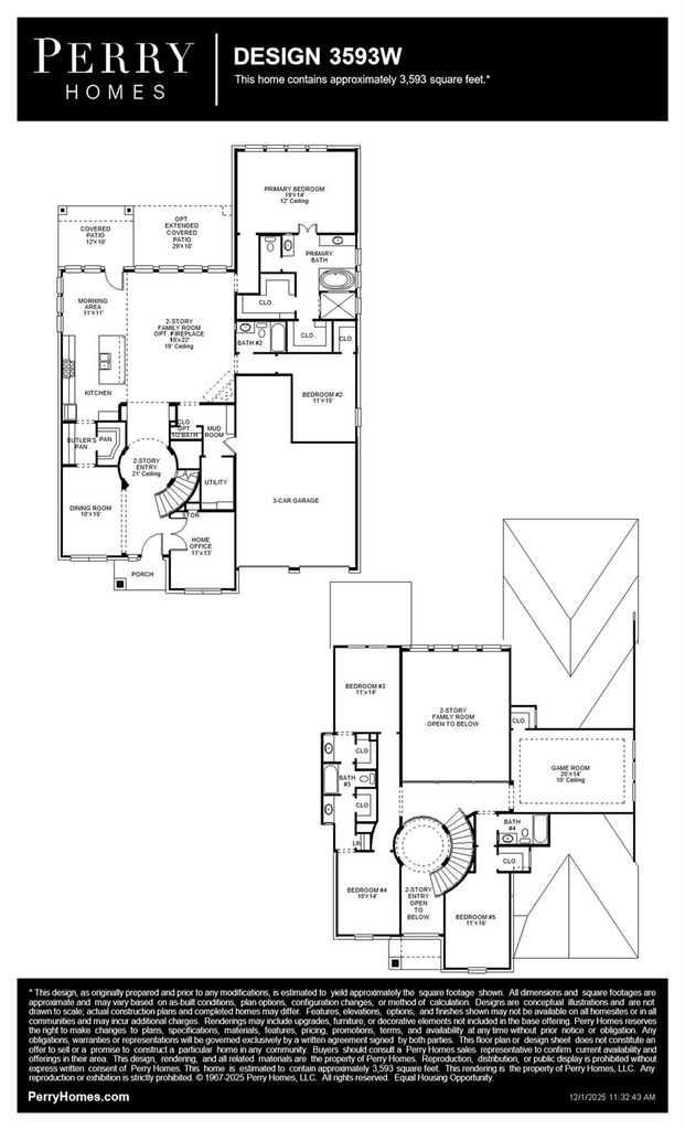 Two-story entry features curved staircase. Formal dining room and home office with French doors frame entry. Two-story family room with wall of windows and a wood mantel fireplace opens to kitchen and morning area. Kitchen features walk-in pantry, butler's pantry, a 5-burner gas cooktop, and island with built-in seating space. First-floor primary suite includes bedroom with 12-foot ceiling and wall of windows. Dual vanities, corner freestanding tub, separate glass-enclosed shower and two walk-in closets in primary bath. A second bedroom is downstairs. A game room, Hollywood bathroom and secondary bedrooms are upstairs. Extended covered backyard patio. Mud room off three-car garage.