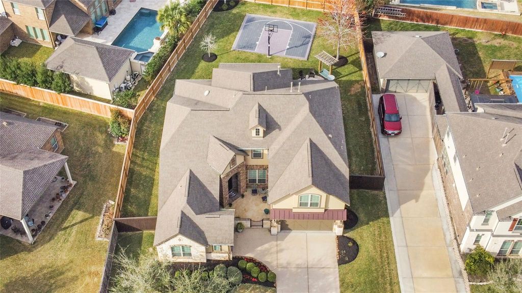 This exceptional residence checks every box: 5 beds & 4.5 baths, with a spacious lot & thoughtful upgrades, including a whole-home generator. Other impressive upgrades are the three-car garage, outdoor kitchen, & private sports court, which set the tone for both elevated entertaining & everyday enjoyment. Just off the entry, a private guest suite with its own ensuite bath on the first floor. The primary suite is also conveniently located on the main level. The kitchen is a true showpiece, featuring a stunning brick-surround hearth, gas burner cooktop, RO water system at the sink & connects to the dining and living areas. Downstairs, the home includes a generously sized private office with glass doors. Upstairs features a fully furnished media room, game room, three additional bedrooms, and two baths. Thoughtfully designed to meet the needs of a modern family. Located within walking distance to Wood Creek Elementary with exceptional community amenities, and just minutes from I-10.