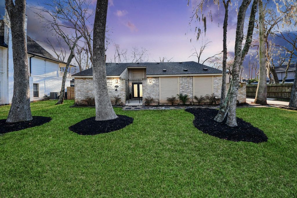 Designed with classic mid-century architectural lines, this beautifully updated one-story ranch blends timeless design with modern comfort. A dramatic vaulted ceiling with exposed beam anchors the expansive living area, highlighted by a striking brick fireplace wall & a connection to the outdoors. The updated kitchen offers both function & style, opening into the main living spaces, ideal for everyday living & entertaining. Blonde luxury continuous flooring adds warmth & cohesion throughout the home. The private primary suite serves as a retreat, featuring its own atrium, a spa-inspired updated bath, & separation from the secondary bedrooms. The two additional bedrooms enjoys access to its own bathroom. Multiple outdoor entertaining areas extend the living experience, all set on a massive oversized lot. A courtyard-style entry reflects the era’s signature architectural charm, while a recently replaced roof offers added peace of mind. All in desirable Pecan Grove!