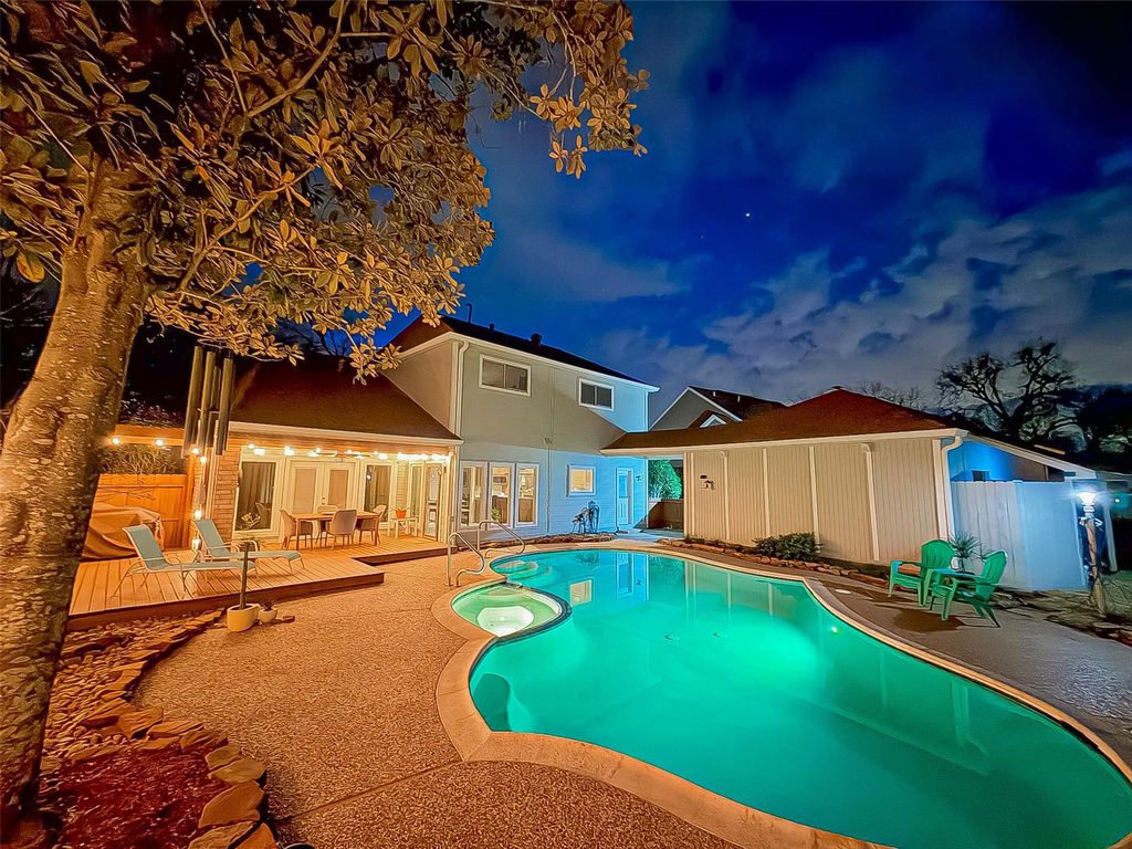 Located in the highly sought-after Pecan Grove Plantation, this beautifully maintained 4-bedroom, 2.5-bath home sits on a generous 11,222 sq ft cul-de-sac lot offering added yard space and privacy. Soaring ceilings and abundant natural light fill the main living areas, while the family room features a double-sided gas fireplace shared with a private home office. The updated kitchen and breakfast area overlook the backyard retreat with a heated pool, expansive deck with electric awning, and outdoor speakers—perfect for entertaining or relaxing. The primary suite features French doors leading to the deck and pool, and a spa-like bath with separate vanities, soaking tub, large shower, and skylight with remote shade. Upstairs offers three additional bedrooms and an updated full bath. Additional highlights include a whole-home generator, updated windows, roof (2024), exterior paint (2025), and interior paint (2024).