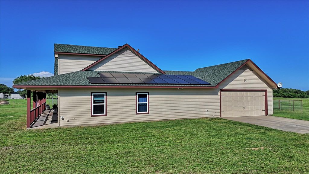 Beautiful 14± acre horse property in Bowie with a custom 2,300± sq ft home built in 2006. This inviting property offers hay-producing pasture, no-climb and pipe fencing, a 30x30 insulated shop with electric and HVAC, and a loafing barn with two 15-ft stalls—perfect for horses and equipment. The home is also equipped with paid-off solar panels, providing excellent energy efficiency and noticeably lower electric bills. Inside, the open kitchen features custom pecan cabinets, granite countertops, a butcher-block island, ceramic farmhouse sink, gas cooktop, and double oven. The kitchen flows into a warm, spacious family room with vaulted ceilings, built-ins, and a stunning rock wood-burning fireplace with gas starter and dedicated firewood storage. It’s a true WOW moment when you walk in. The home includes 3 bedrooms, 2 bathrooms, and a versatile media room with built-in surround sound. The primary suite offers a large bedroom, luxurious bath with double vanities, walk-in shower with multiple shower heads, a garden tub with countryside views, and a huge walk-in closet. The well-designed laundry room includes a sink, abundant cabinetry, space for a deep freeze, a skylight, and convenient access to both the master closet and garage. Additional features include hardwood floors throughout most of the home, propane heat, two HVAC units, two hot water heaters, attic access in the master closet and garage, and a Class 4 roof replaced in 2008. The insulated well house sits on a slab for added durability. Enjoy peaceful views from the large front porch that wraps around to the side of the home. The circle drive is wide enough for trailers, making hauling horses or equipment easy. The fenced backyard provides secure space for pets and family. This property blends comfort, craftsmanship, and country living—complete with its own landmark, “Scraggles,” the beloved 300-plus-year-old tree. A rare find with room to roam. Schedule your showing today.
