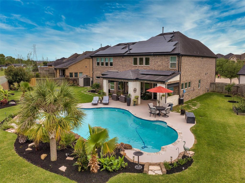Situated on an oversized 1/3 acre lot with no rear neighbors, this 4–5 bedroom, 3.5 bath home in Silver Ranch offers nearly 4,000sqft of thoughtfully designed living space just minutes from Cinco Ranch amenities. Interior highlights include 10’ ceilings, 8’ doors, upgraded tile flooring, and a custom wood staircase. Flexible floor plan with media room featuring blackout shades and private bar area. Open-concept kitchen, living, and dining spaces designed for everyday living and entertaining. Laundry room with ceiling-height cabinetry. Primary suite features a custom-built closet with full built-ins and center island.Backyard includes pool, spa, outdoor kitchen, and covered patio with power-operated screens. Pool updates include new pump motor, chlorinator system, and sealed decking. Privacy with no back neighbors. Energy-efficient 40-panel solar system with 3 backup batteries (~90 kWh). 3-car garage, extended driveway, full-home camera system, and 10-zone sprinkler system.