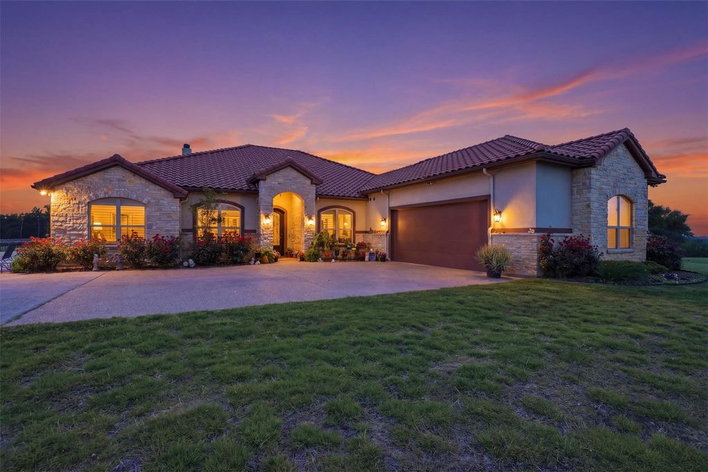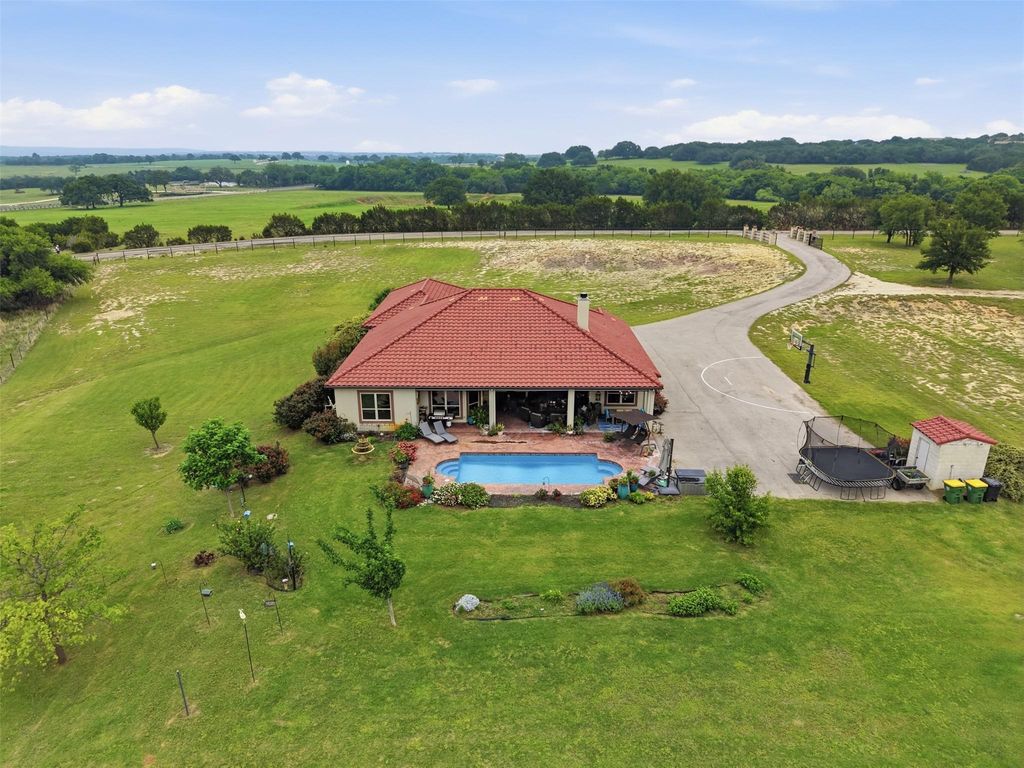 Set on 10 picturesque acres, this stunning estate offers the perfect blend of refined comfort, functionality, and wide-open Texas living. Upon arrival, the beautiful perennials and warm architectural details create a lasting first impression. The land is dotted with beautiful oak trees, a seasonal pond, and a large stone fire pit. Inside, the home welcomes you with an open-concept design, abundant natural light, and elegant finishes. The spacious living area features a striking stone fireplace and seamless flow into the kitchen, complete with rich cabinetry, granite countertops, a large island, bar seating, and a dedicated ice maker. The kitchen also offers a walk-in pantry plus a second pantry, providing exceptional storage. The home includes both a formal dining room and a breakfast room with exceptional views. The primary suite is a serene retreat, showcasing a tray ceiling, generous natural light, and a spa-like ambiance. The en suite bath features dual walk-in closets, with the largest doubling as a concrete storm shelter. Throughout the home, plantation shutters and motorized shades provide both style and convenience. Step outside to your own backyard oasis, where a covered patio with motorized screens allows for year-round enjoyment. The sparkling pool, lush landscaping, and multiple seating areas create the perfect setting for relaxing or entertaining. From the back porch, enjoy gorgeous sunset views stretching across the surrounding acreage. The home is enhanced with decorative jellyfish-holiday lighting, adding charm and appeal year-round. For those needing additional workspace or storage, the property includes a 24x24 metal building with a concrete floor and a 12x21 greenhouse. A spacious attic provides an abundance of easily accessible storage. With expansive open land, scenic views, and thoughtful upgrades throughout, this exceptional property delivers the ideal balance of luxury, privacy, and country living—just waiting to be called home.